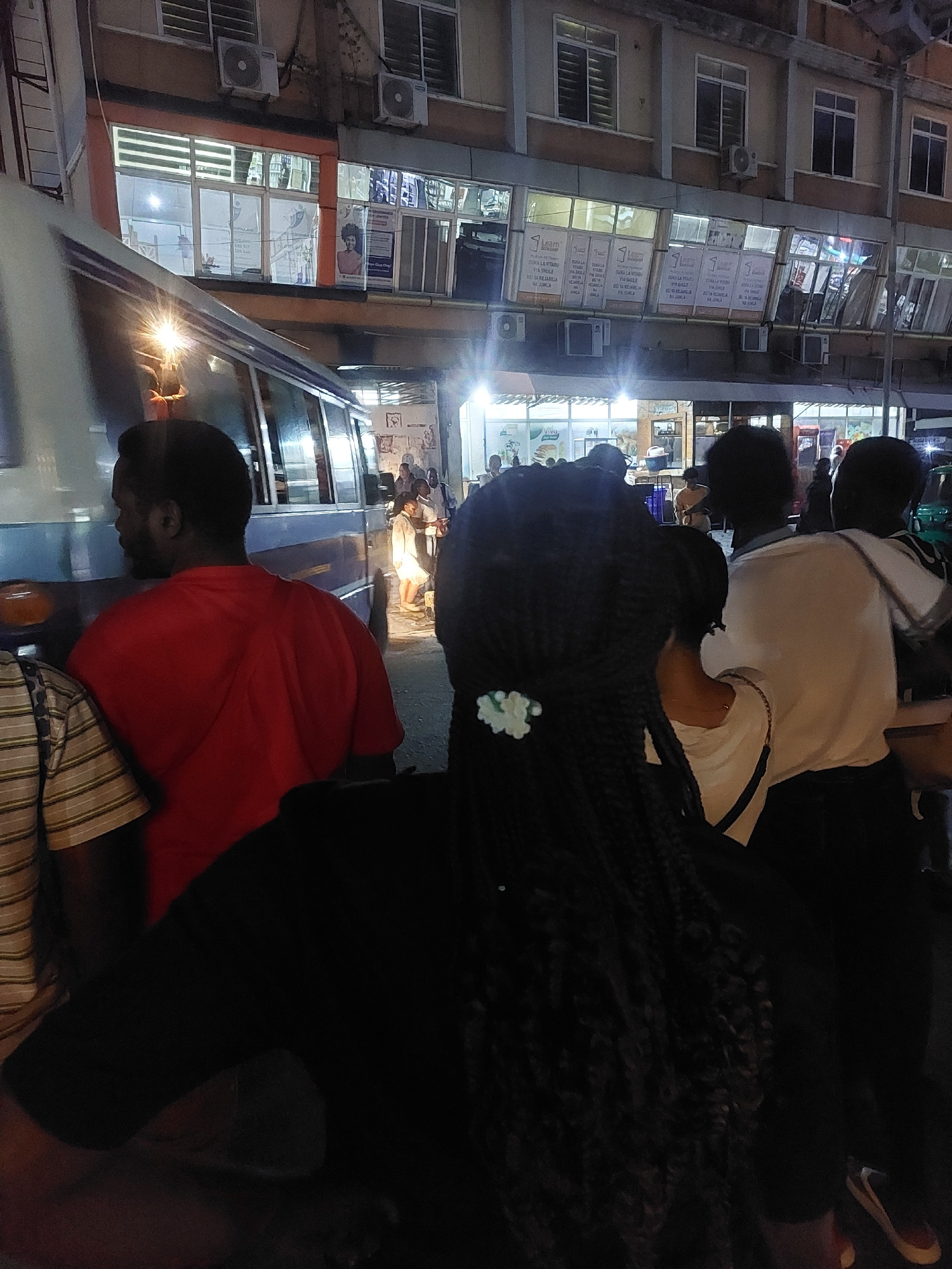 This is an image of a street scene at night in Dar es Salaam, Tanzania. The main focus is on a group of people gathered at the side of what appears to be a public transportation vehicle, possibly a D…read more