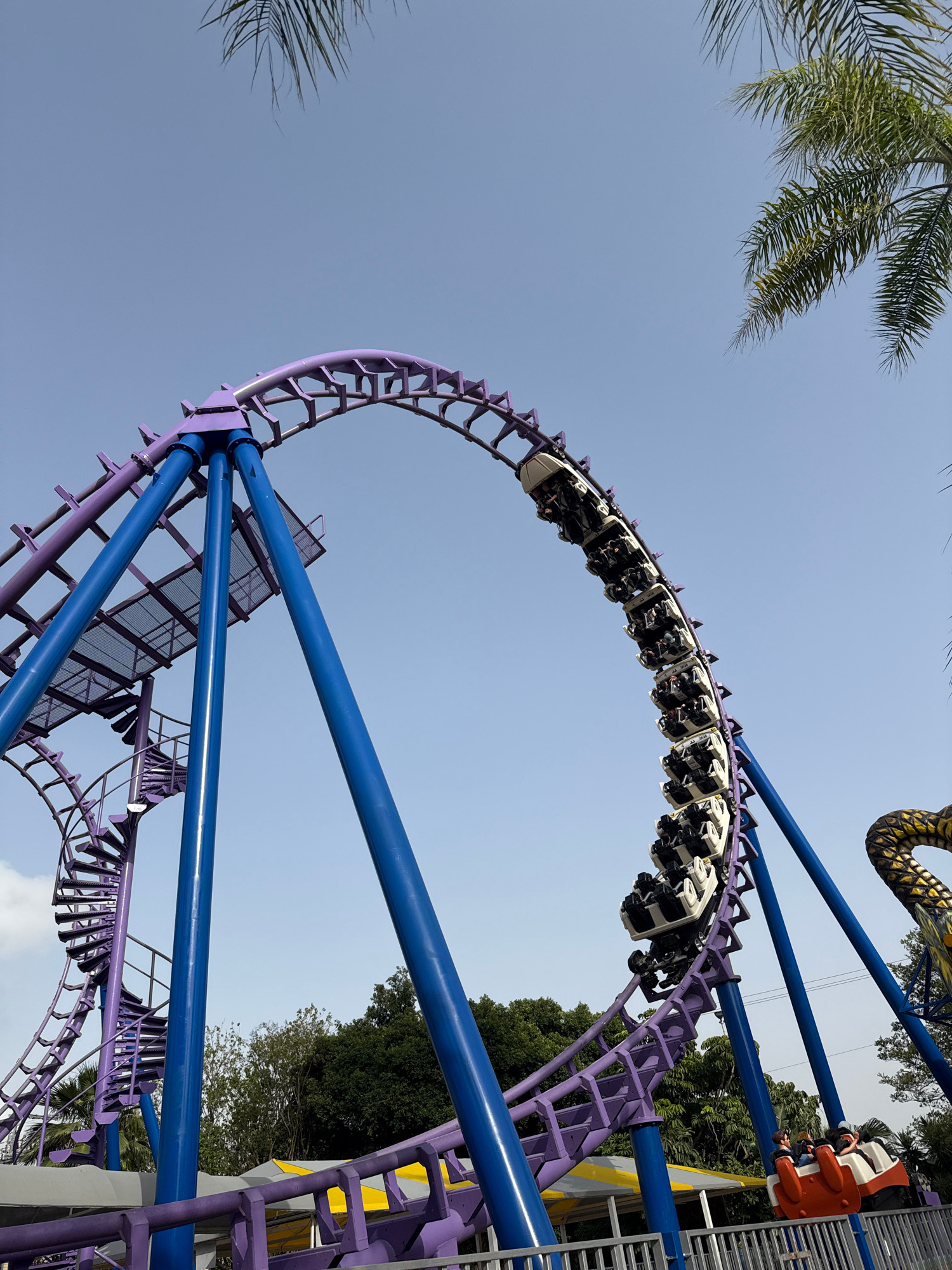 A low-angle shot depicts a rollercoaster in Tel Aviv, Israel, with a train full of passengers ascending a loop. The track is predominantly purple, supported by blue beams. In the background, a clear b…read more