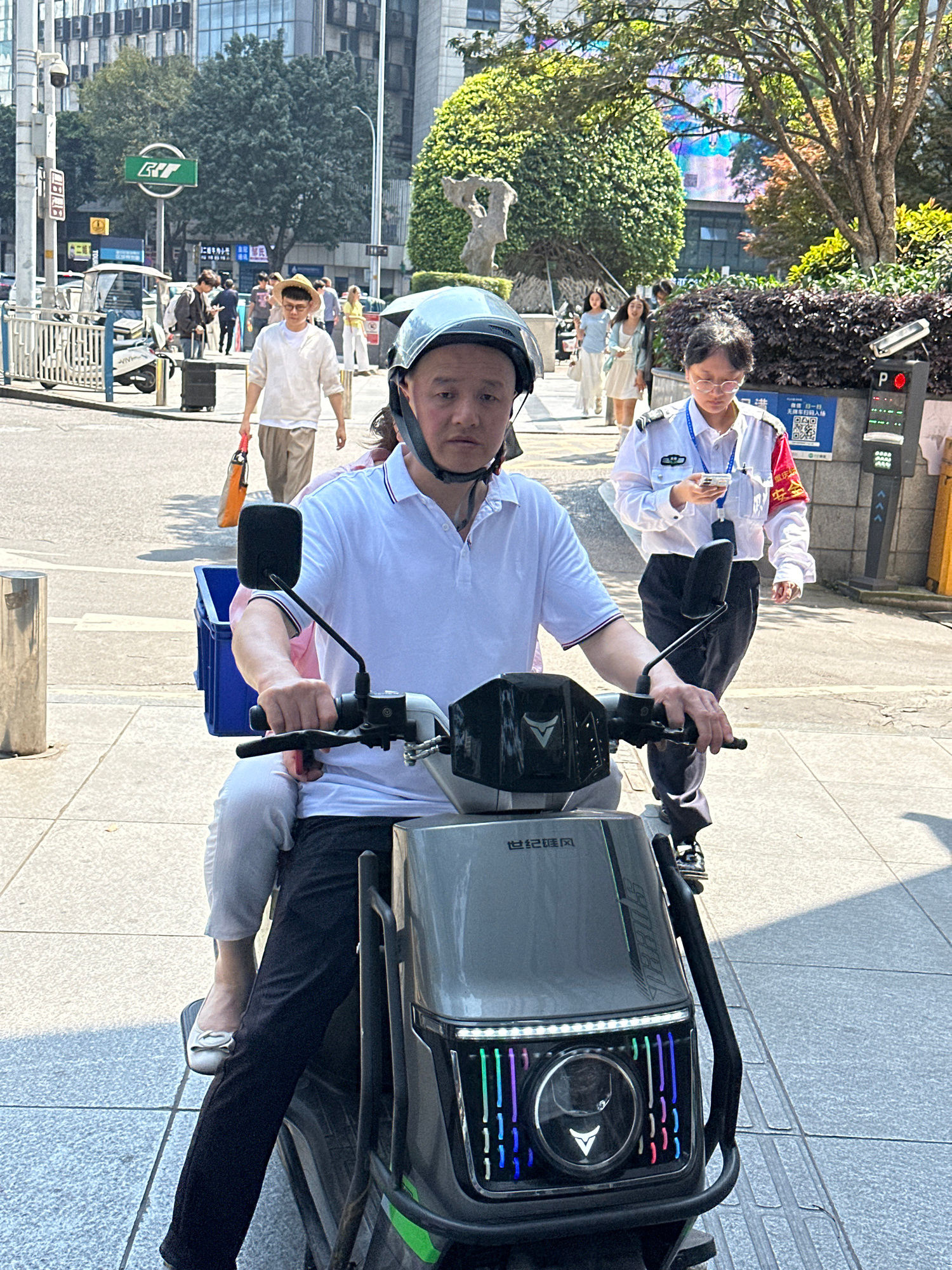 A man wearing a light blue helmet and white polo shirt is seated on a gray electric scooter, facing the camera. The scooter has a distinct head unit with colorful LED lights. The location is Yuzhong D…read more