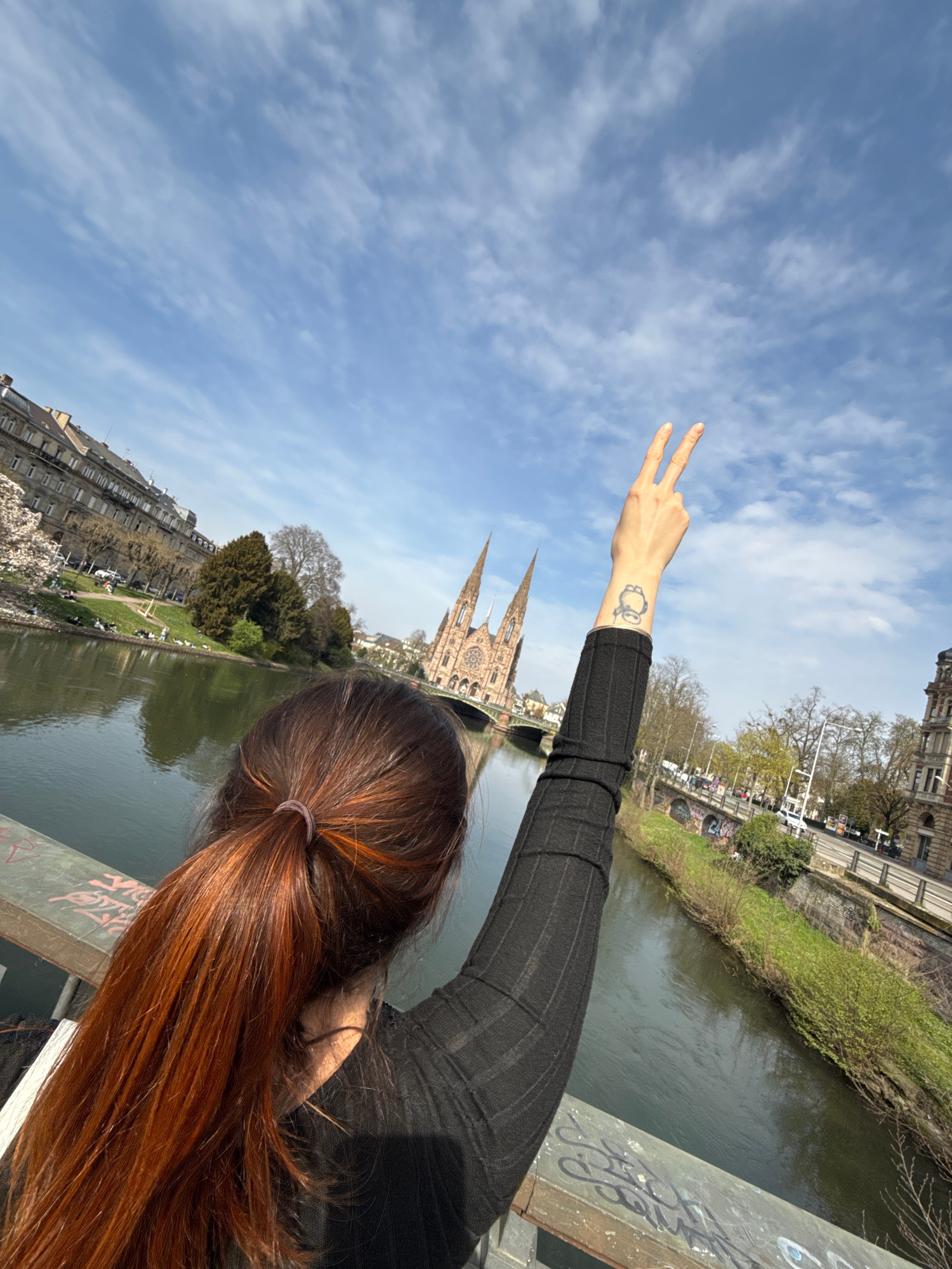 The image depicts a daytime scene in Strasbourg, France, observed from a bridge spanning the Ill River, with Église Saint-Paul (Saint-Paul's Church) as the central distant landmark. In the foreground,…read more