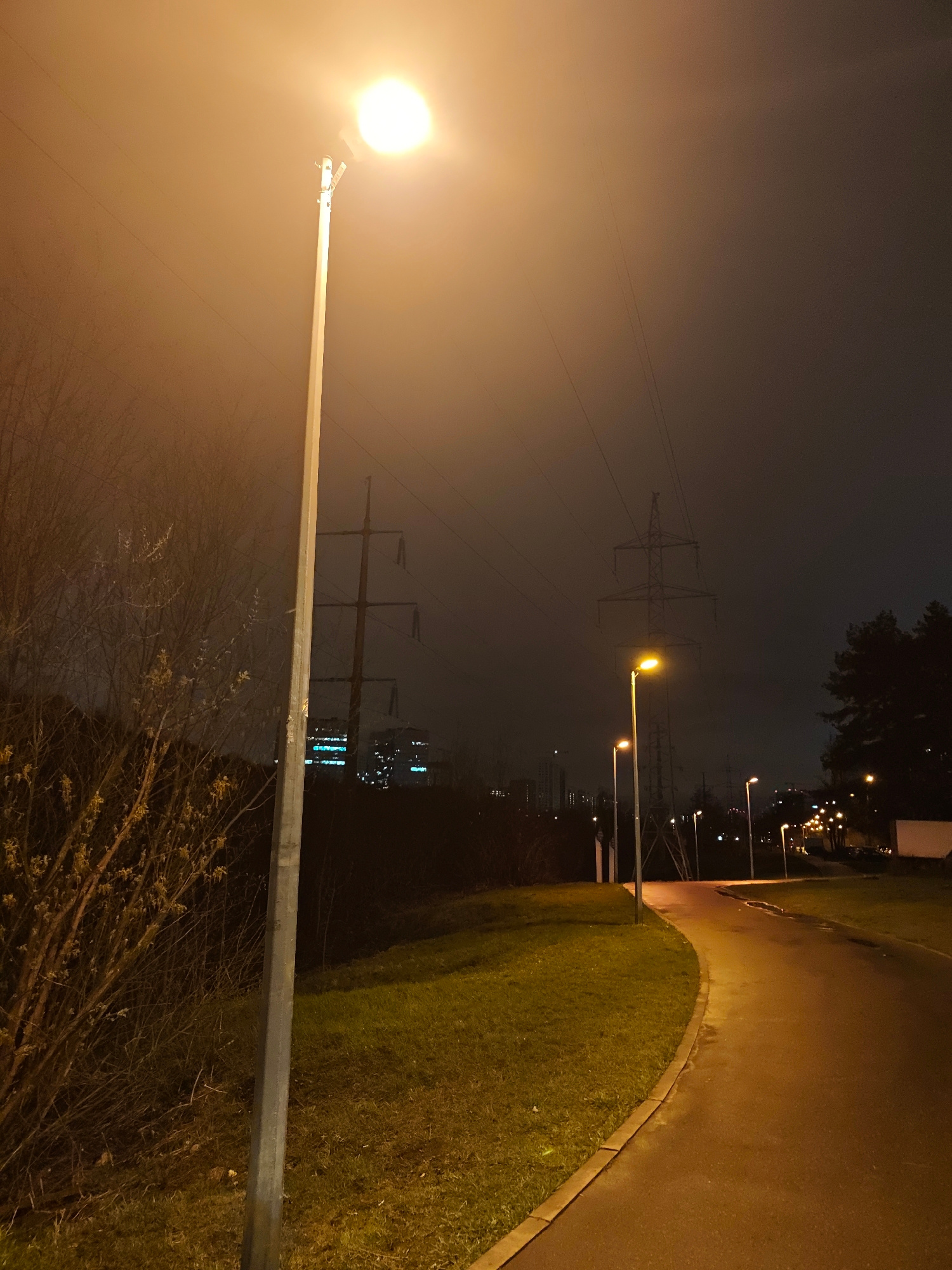 A nighttime scene in Moscow, Russia depicts a curving, wet asphalt path illuminated by a series of streetlights. On the left, a thin-trunked tree with bare branches stands near the path, alongside a pā¦read more