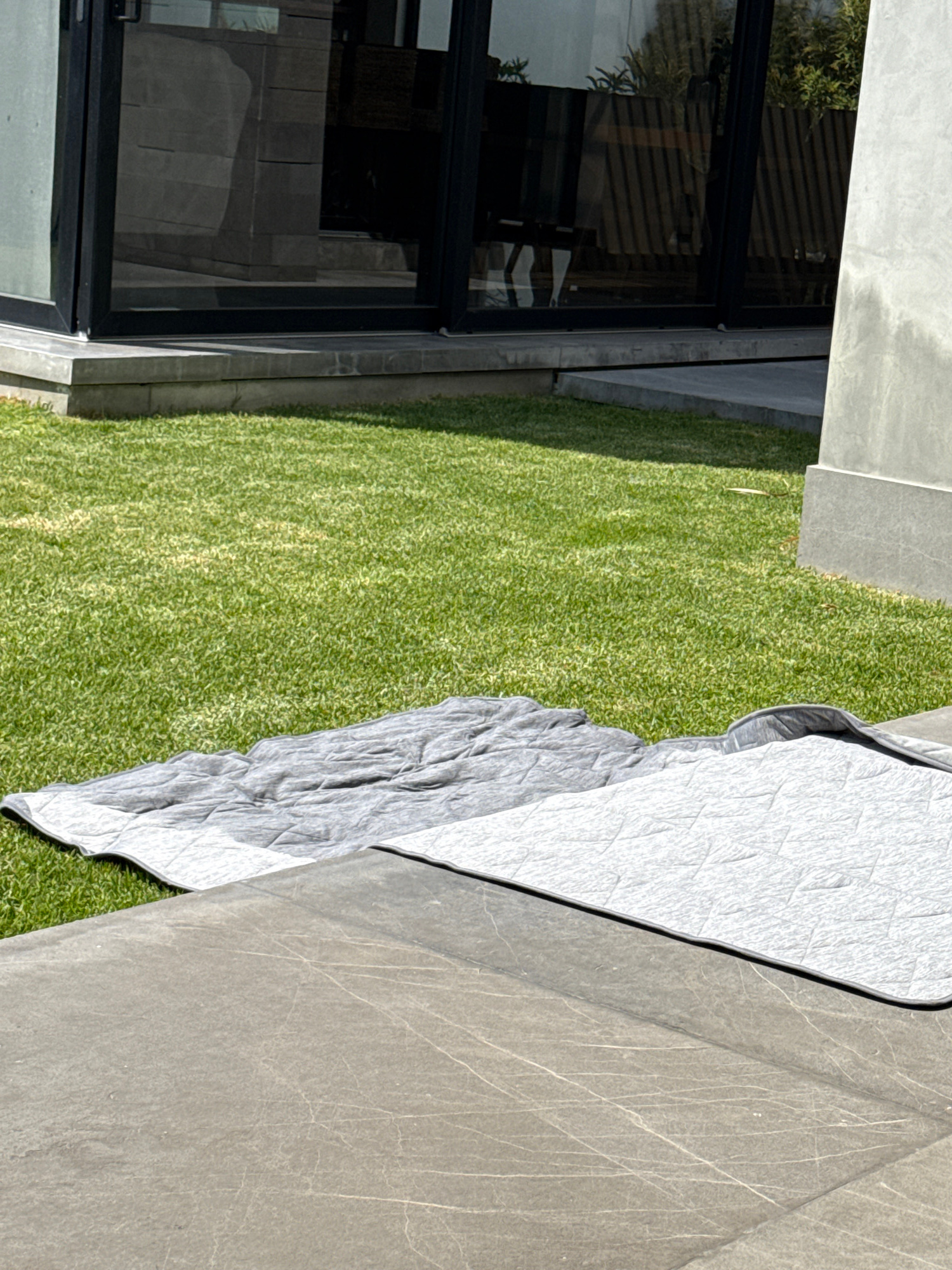 The image shows a patch of green grass next to a building with large glass windows. A gray tarp or cover is partially spread out on the grass and extends onto a section of concrete. The photograph was…read more