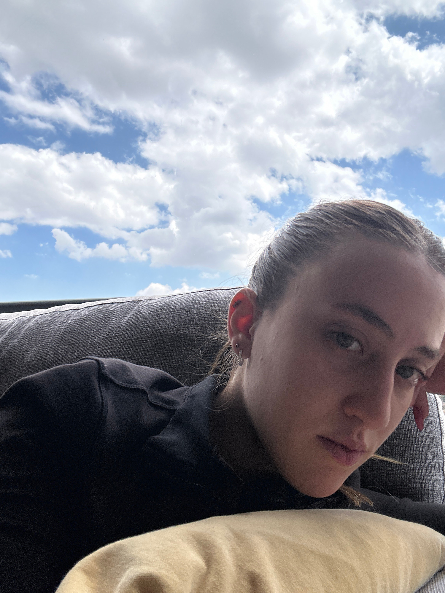A woman is pictured outdoors, angled slightly towards the sky. Cumulus clouds are visible in the background. The woman is partially reclining on a dark grey cushion or sofa with a light yellow pillow…read more