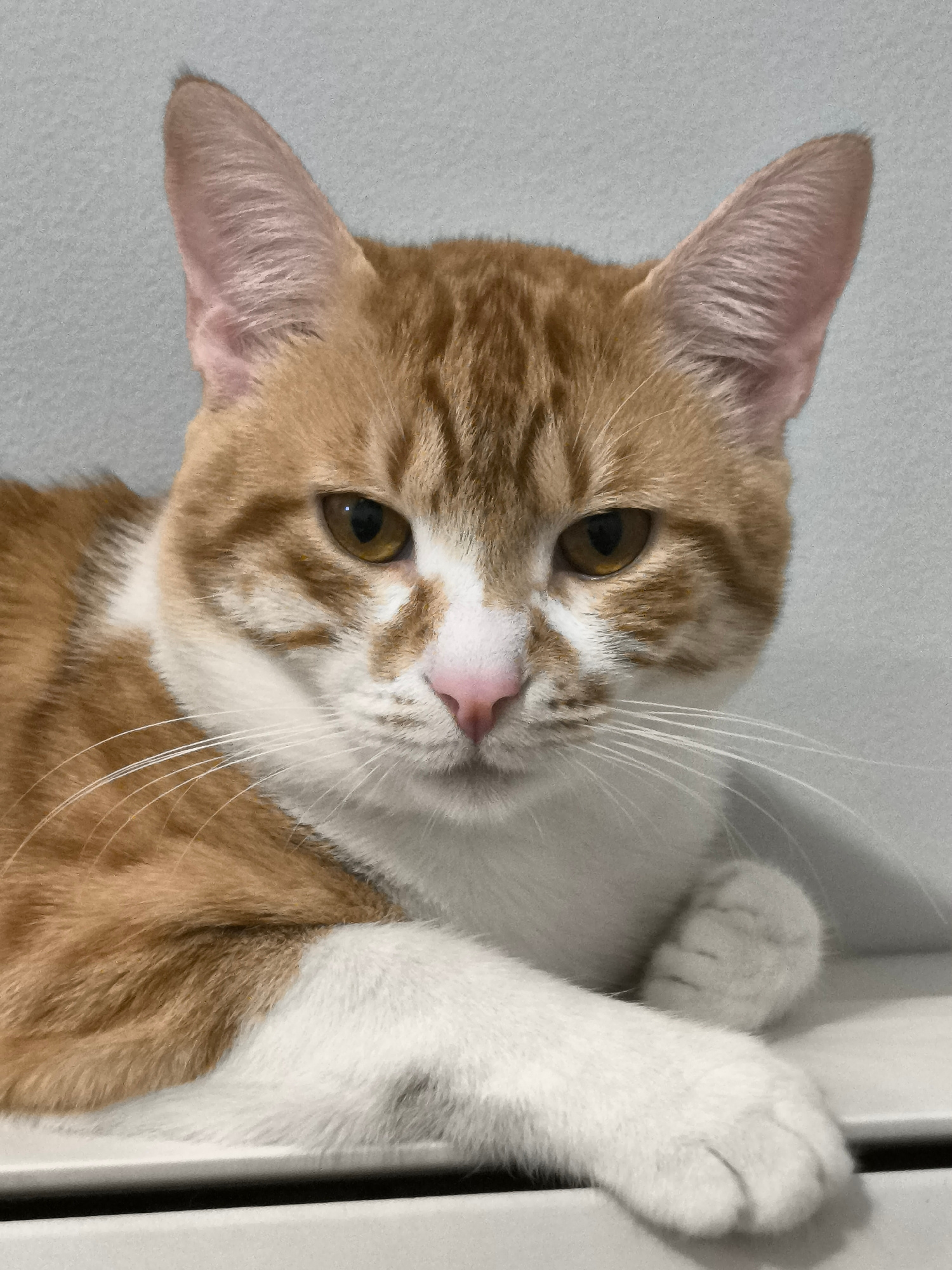 A close-up shot of an orange and white cat with a pink nose and yellowish eyes. The cat is lying down with one paw visible. The background is a plain white or light grey wall. There is no indication o…read more