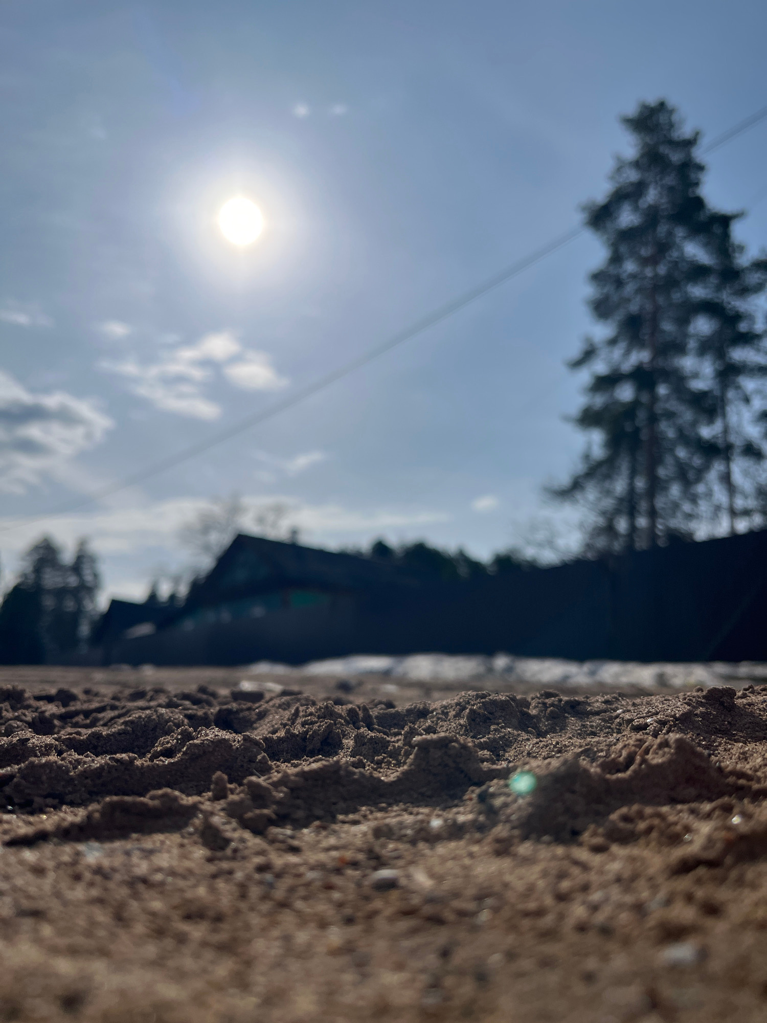 The image, taken in Chaikovsky, Russia, presents a blurred, tilted perspective. The foreground features a close-up of a rough, earthy-brown surface, likely a wall or embankment, showing detailed textu…read more