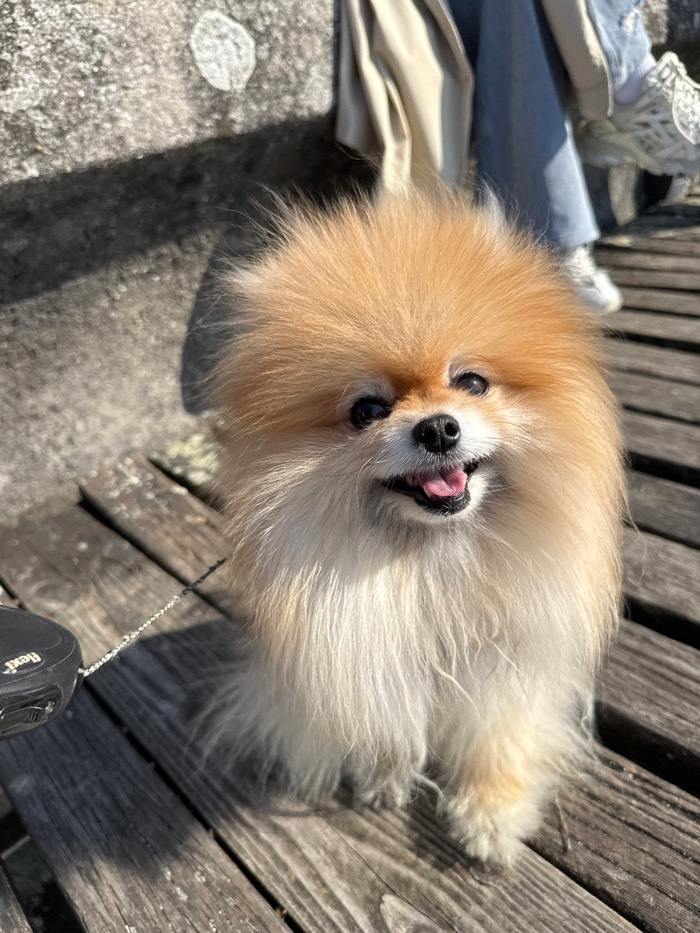 A light-orange and cream-colored Pomeranian dog sits on a dark wooden plank surface, facing forward and slightly left, with its mouth slightly open and tongue visible. Its black retractable leash, bra…read more