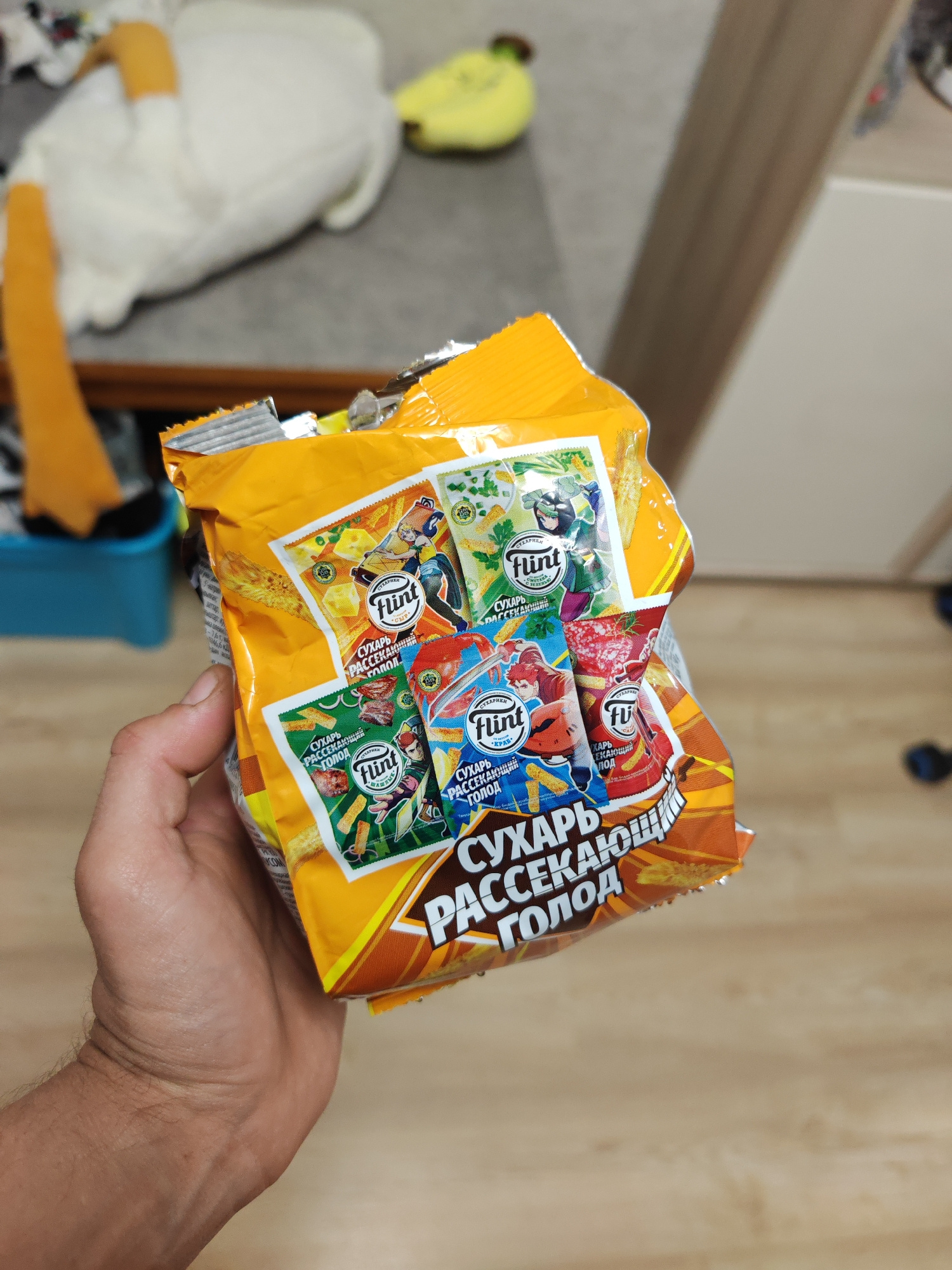 A hand holds a partially opened, bright yellow bag of Flint brand bread crisps. The bag has several different flavor variations depicted on it. The text on the bag is in Cyrillic, specifically, "СУХАР…read more