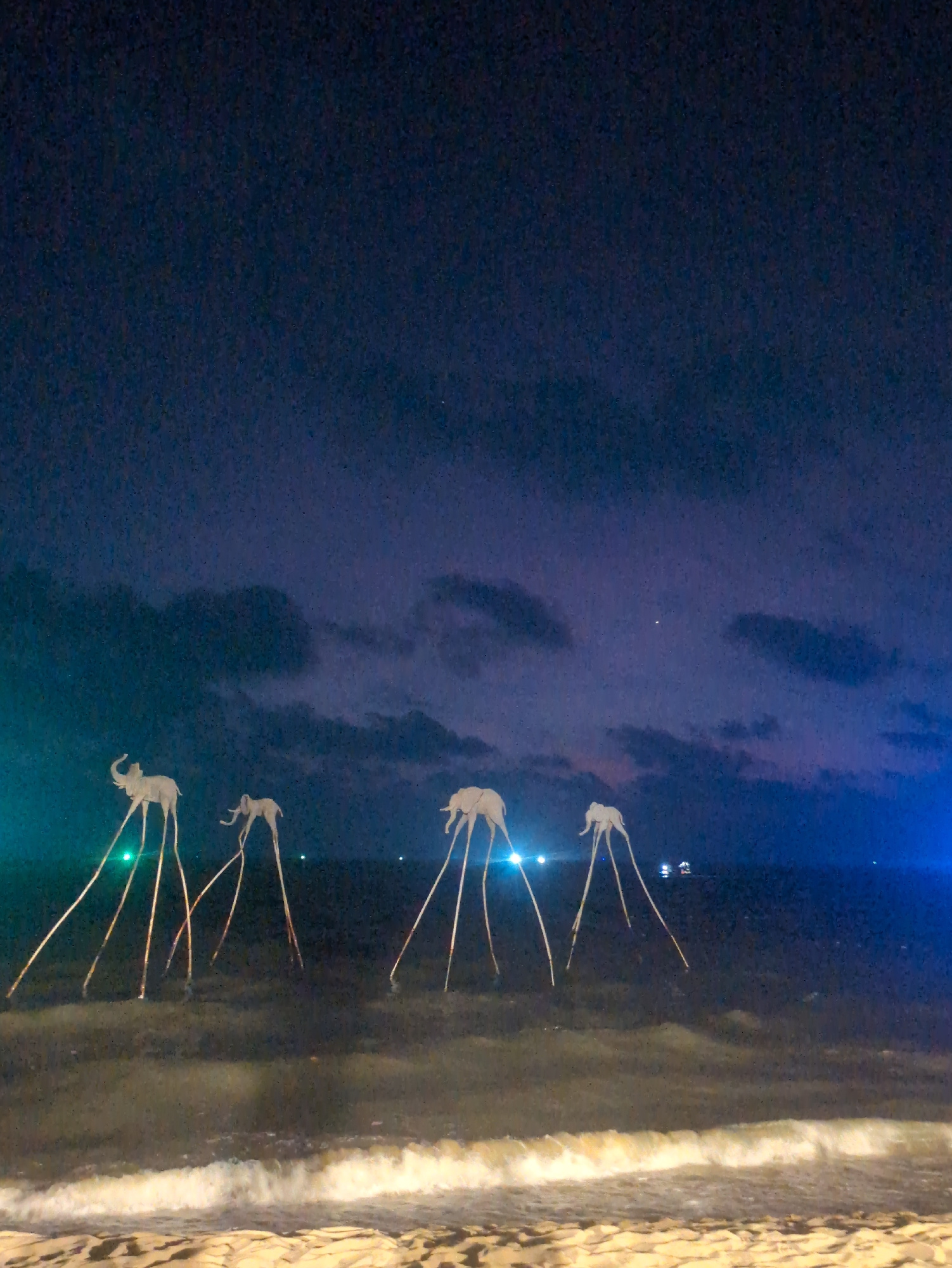 The image shows four Strandið by Theo Jansen sculptures on a beach in Phú Quốc, Vietnam. The sculptures, resembling large skeletons with legs, are illuminated with green lights. The beach is dark with…read more