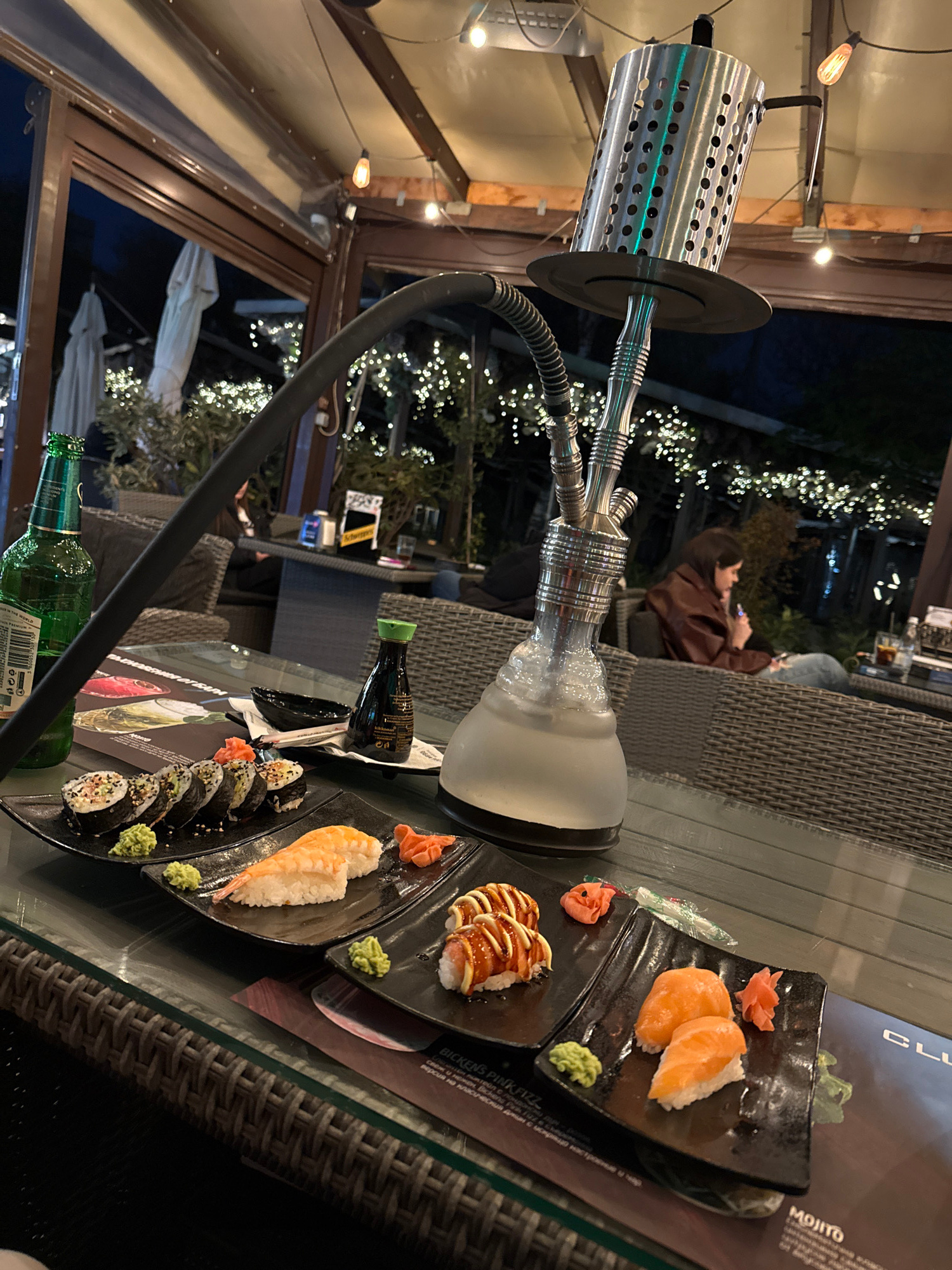 The image presents a nighttime scene at an outdoor restaurant or lounge, characterized by a relaxed and inviting atmosphere. The primary subjects are a prominent hookah and multiple plates of sushi, s…read more