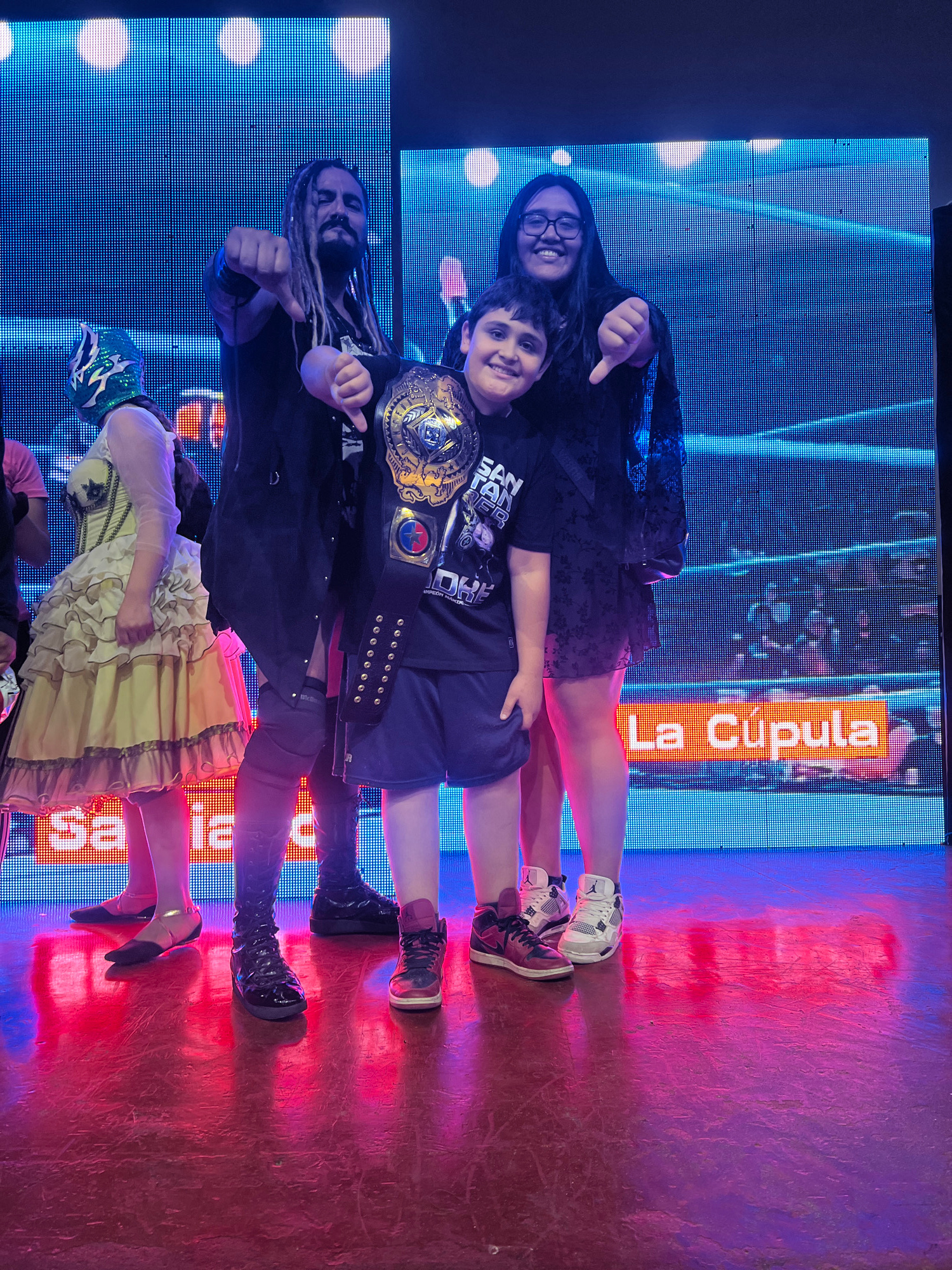 A group of four people are standing in front of a large LED screen. The screen displays blue and white abstract patterns, with some words. The floor is made of red and blue flooring. From top to bott…read more