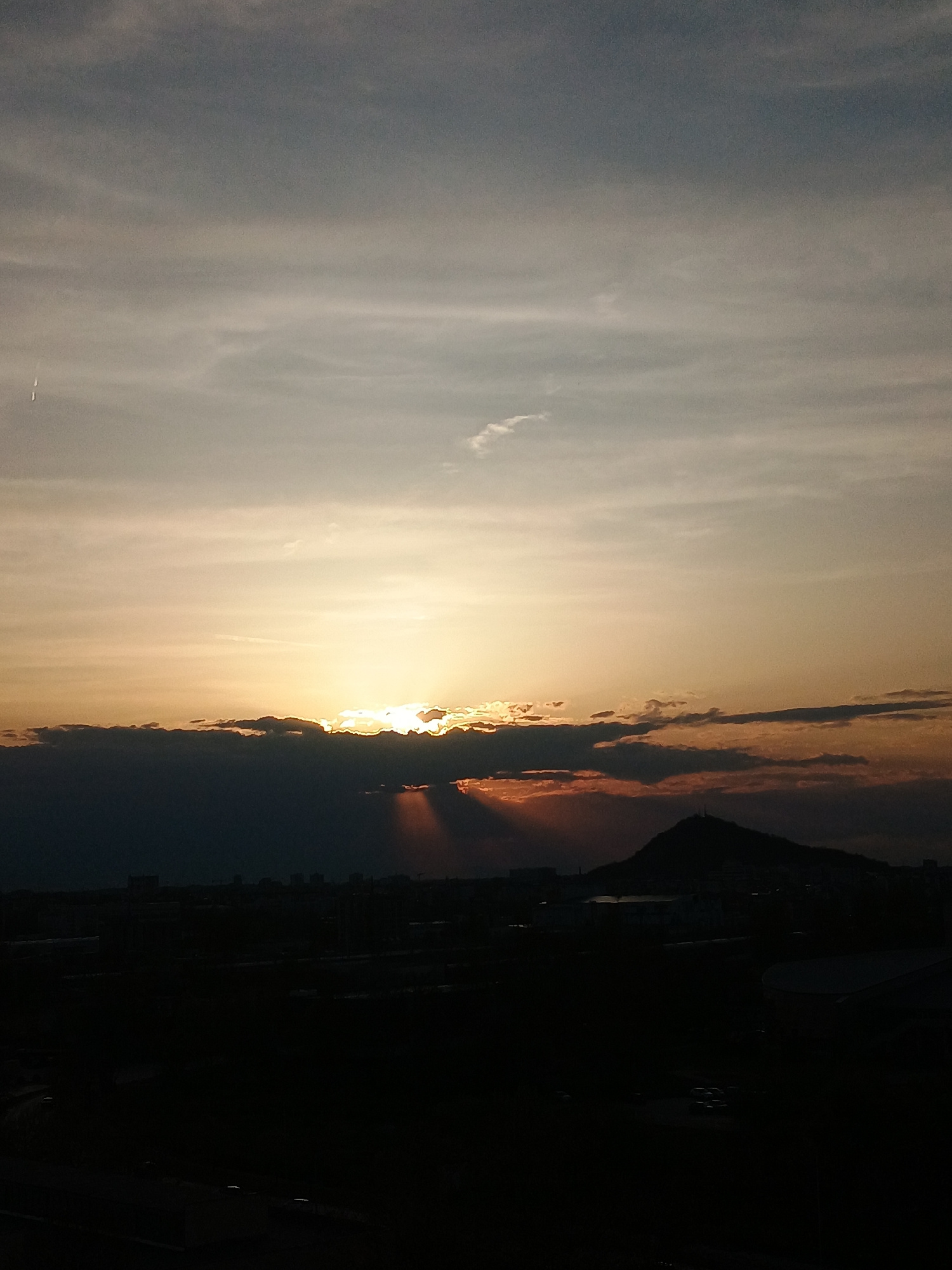 The image captures a sunset scene, likely from a vantage point in Plovdiv, Bulgaria. The sky transitions from a pale blue-gray on the left to a warm, golden-yellow and orange gradient near the horizon…read more