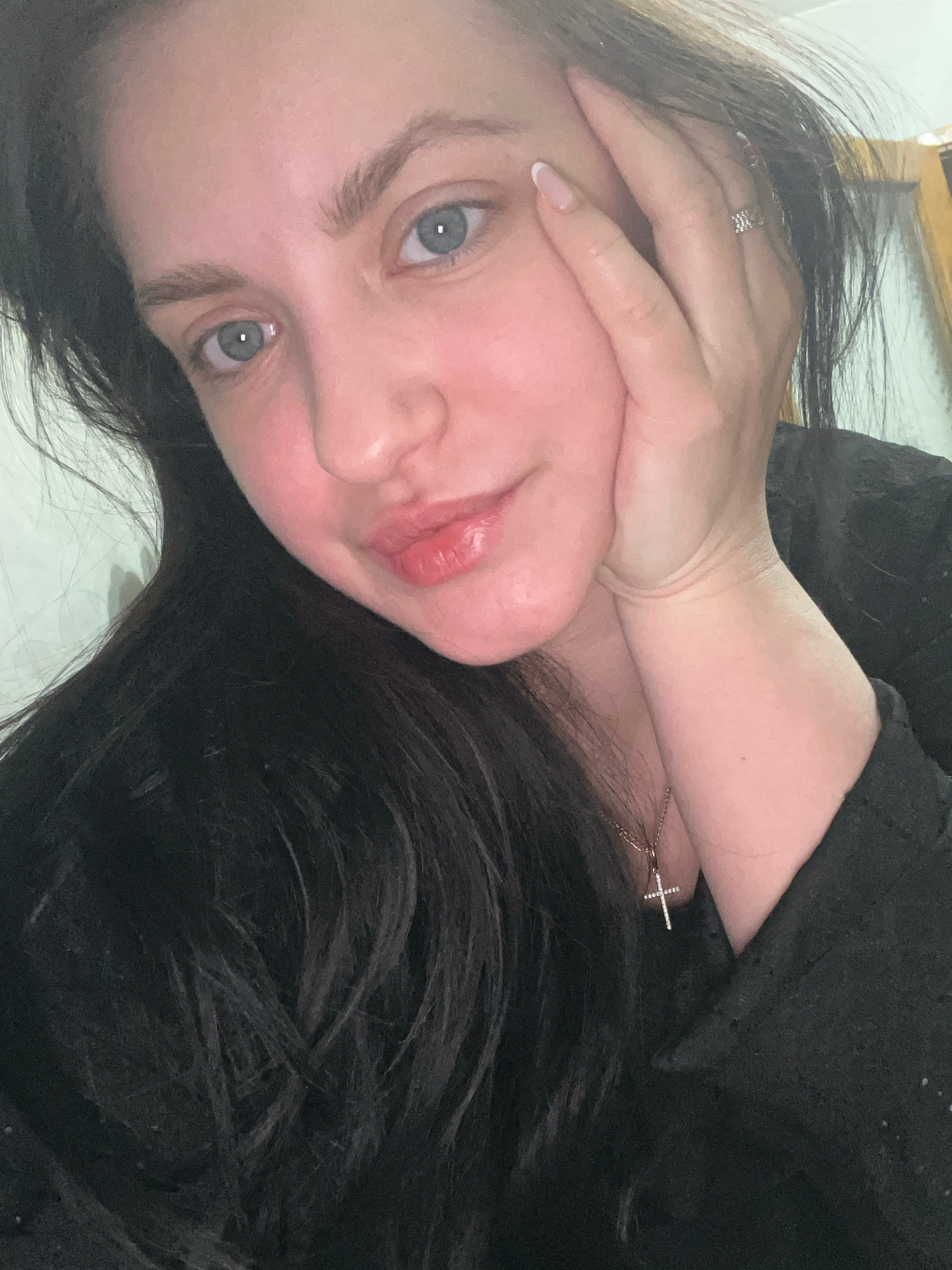 A close-up portrait shows a person, likely a woman, with dark hair, fair skin, and light blue-grey eyes, looking directly at the camera. The image is rotated, suggesting the subject is lying down with…read more