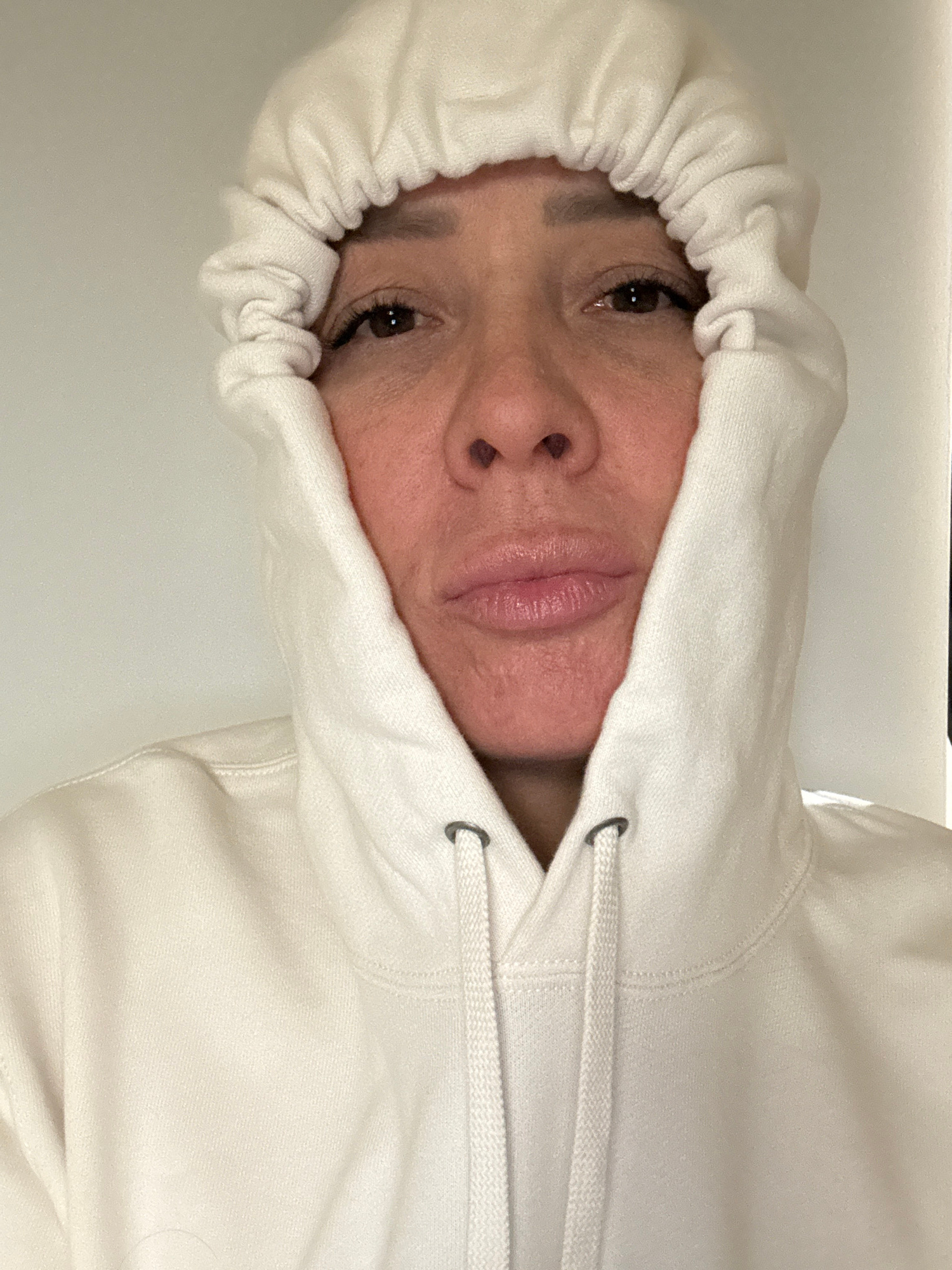A close-up, slightly rotated image shows a person wearing a white hooded sweatshirt. The hood is up, partially obscuring the face, with only the eyes, nose, and mouth visible. The person's skin appear…read more