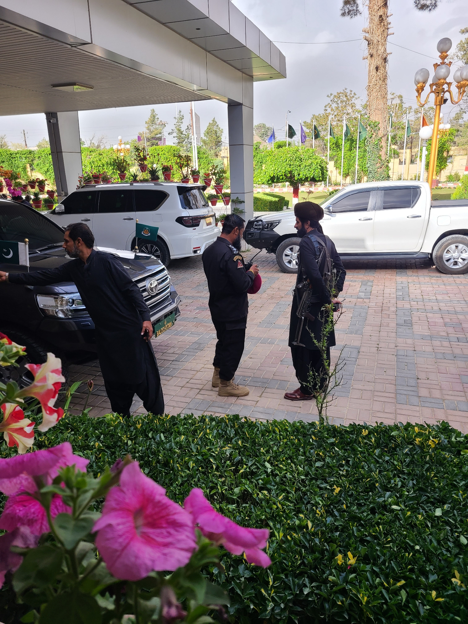 The image shows a scene outside a building in Quetta City Tehsil, Pakistan. Three men are present. Two of the men are wearing dark uniforms and berets and carrying rifles. The third man is wearing bla…read more