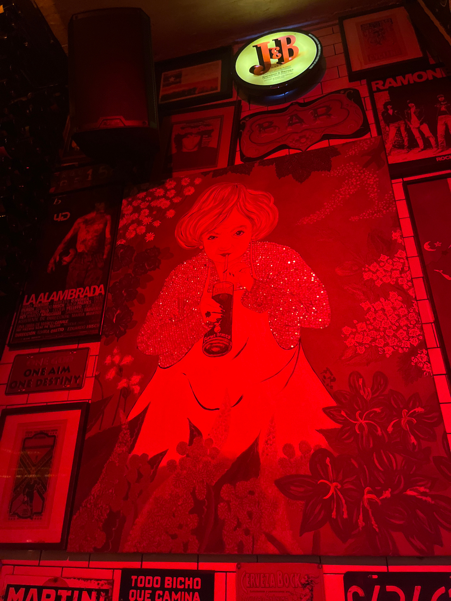 The image shows a wall in what appears to be a bar or entertainment venue, likely located in Buenos Aires, Argentina, as suggested by the Spanish language signage and the presence of brands popular inβ¦read more