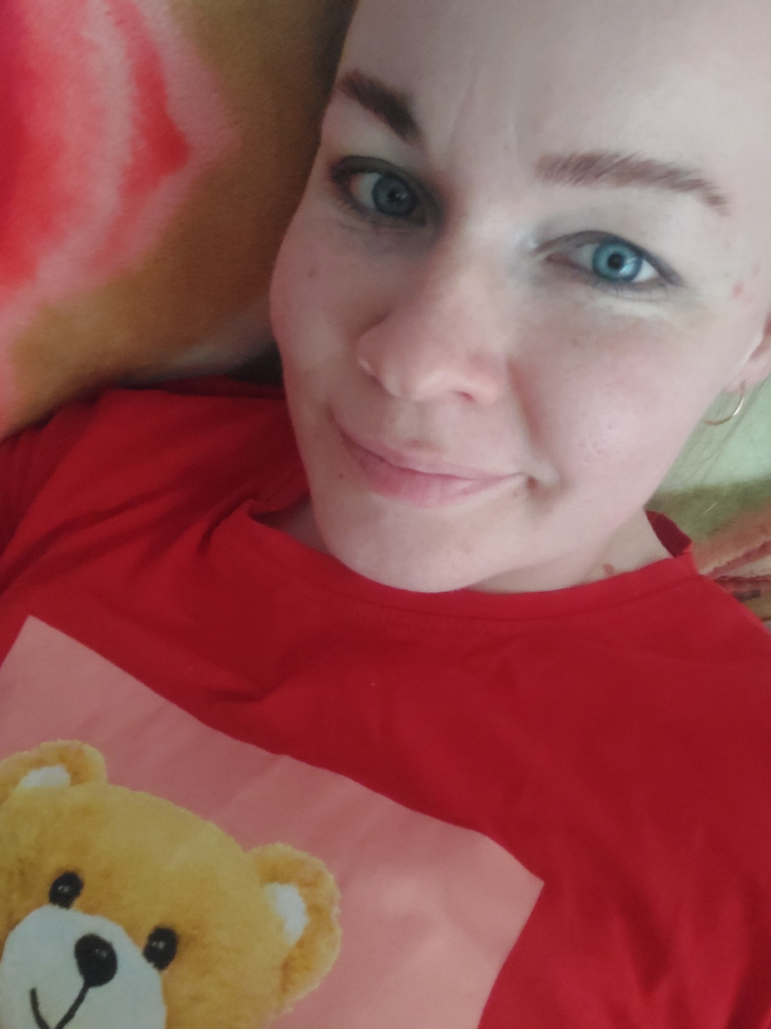 A selfie-style photograph shows a fair-skinned woman with light brown eyebrows and striking blue eyes. She is smiling slightly. A section of a red garment is visible, partially covering a pale pink su…read more