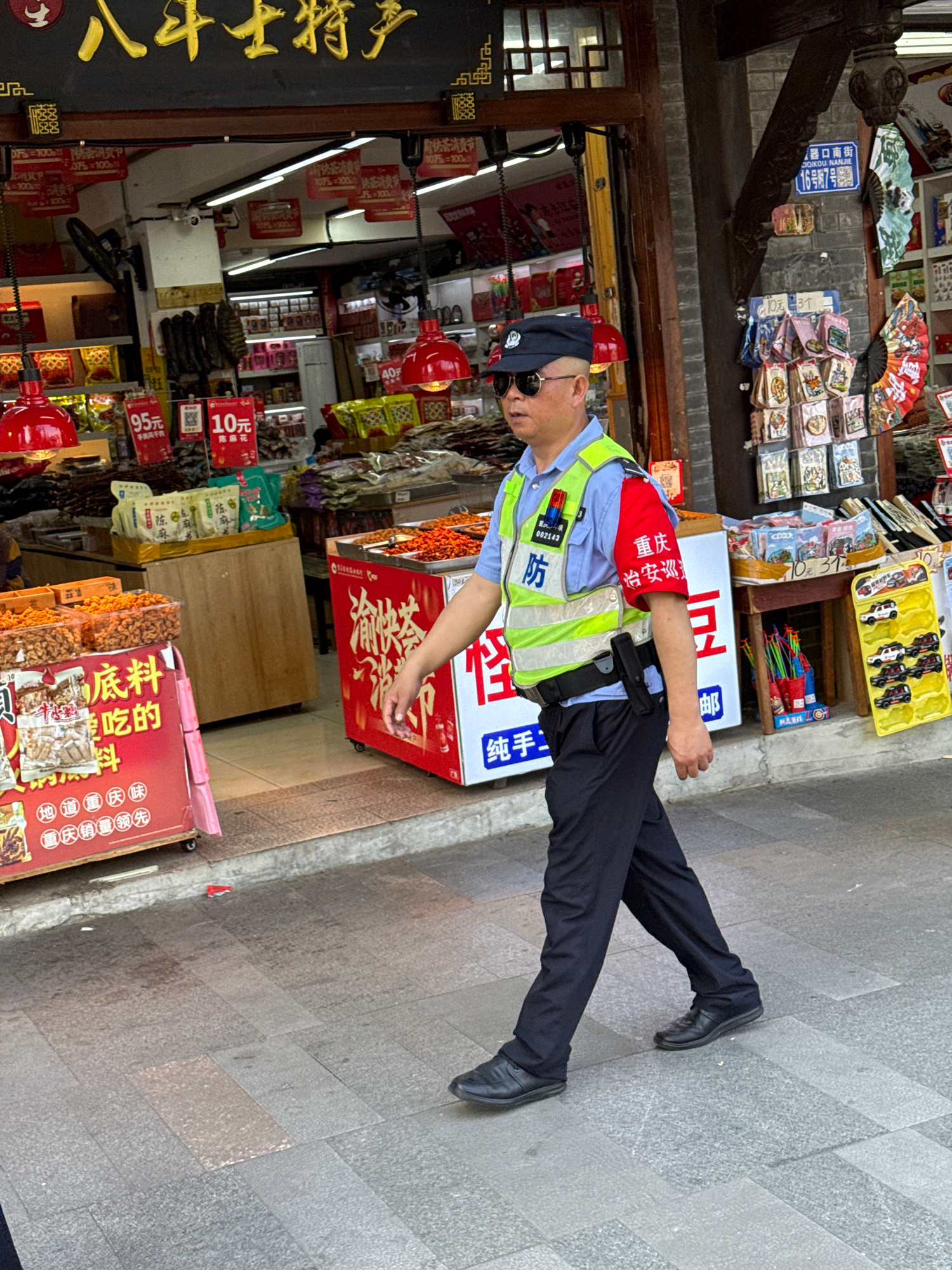 An eye-level outdoor shot depicts a male security or auxiliary police officer standing on a grey paved sidewalk in front of a shop in Shapingba District, China. The man is dressed in a light blue shor…read more