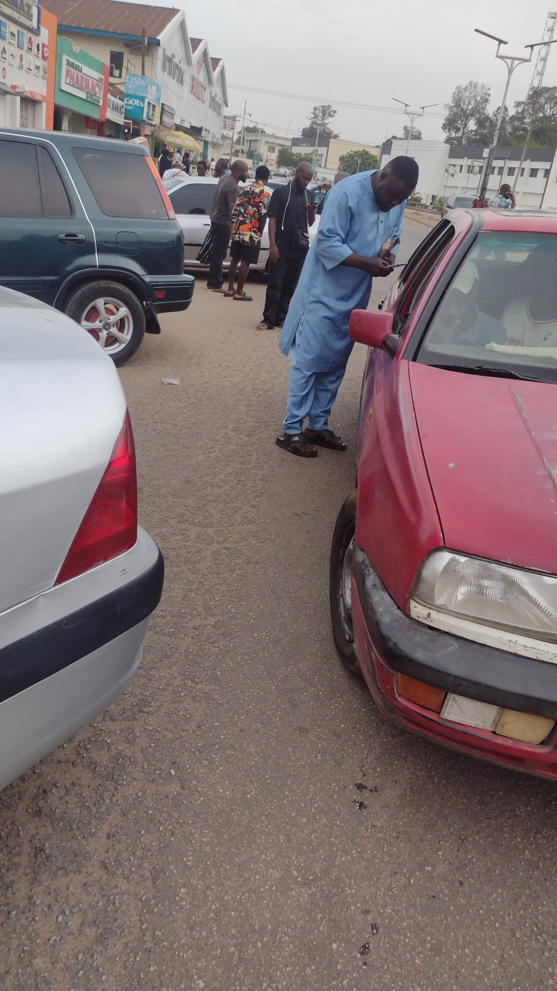 The image shows a street scene in Jos, Nigeria. A man in a blue traditional outfit is standing next to a red car, possibly inspecting it or interacting with someone inside. There is a small gathering…read more