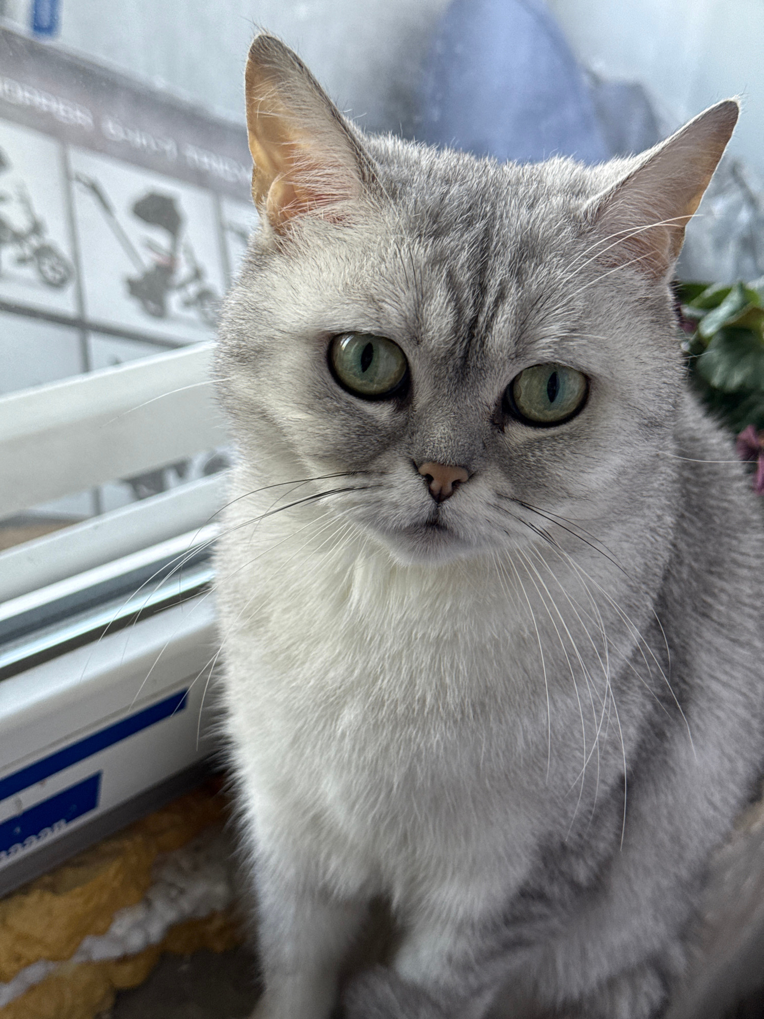 A close-up, slightly tilted portrait shows a domestic short-haired cat with light gray, silvery fur and distinctive tabby stripes, especially visible on its forehead and cheeks. The cat has striking,…read more