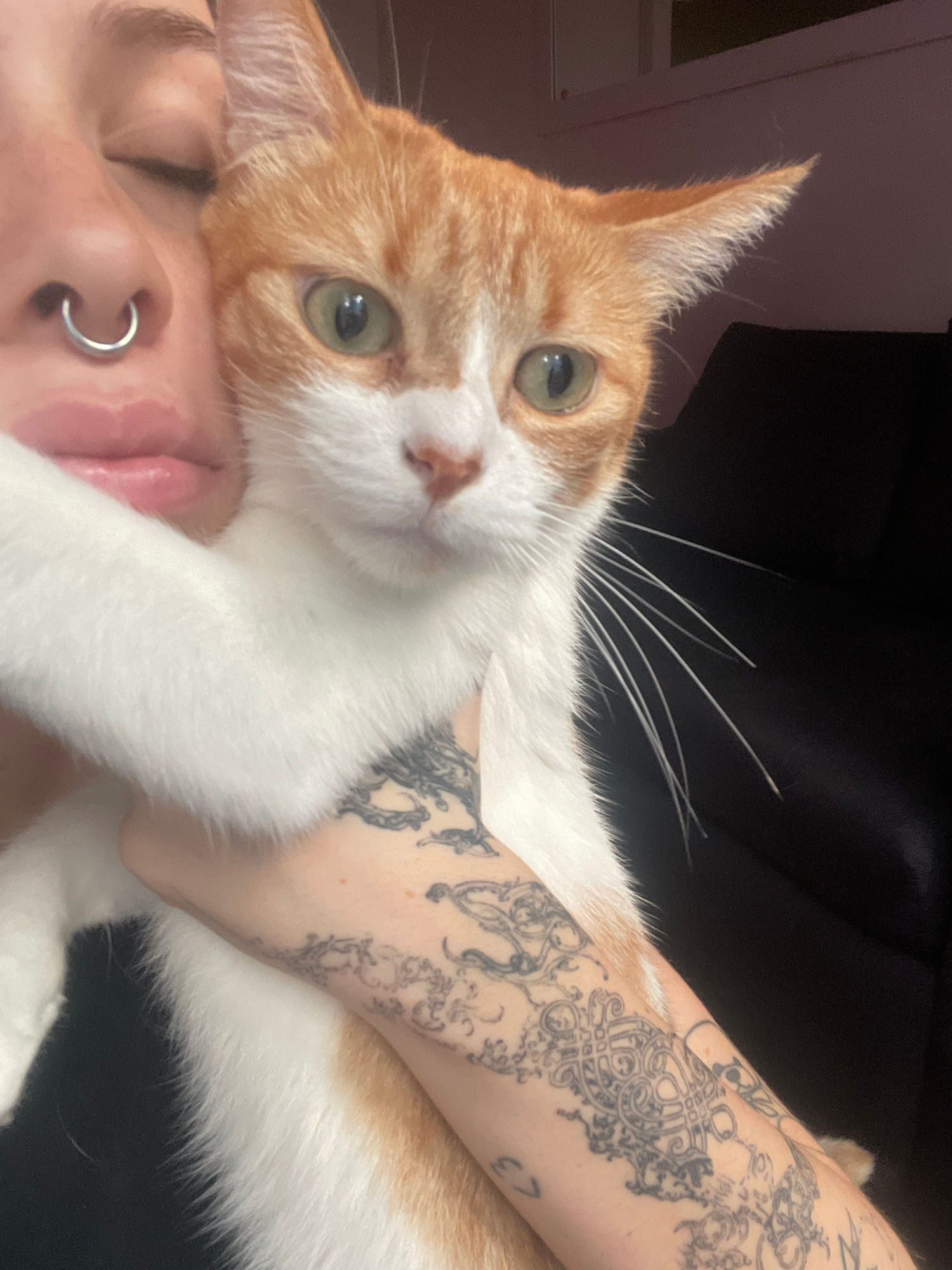 A person is holding an orange and white cat. The cat's head is resting on the person's face. The person has a nose ring and visible tattoos on their arm. The background appears dark. There is no indic…read more
