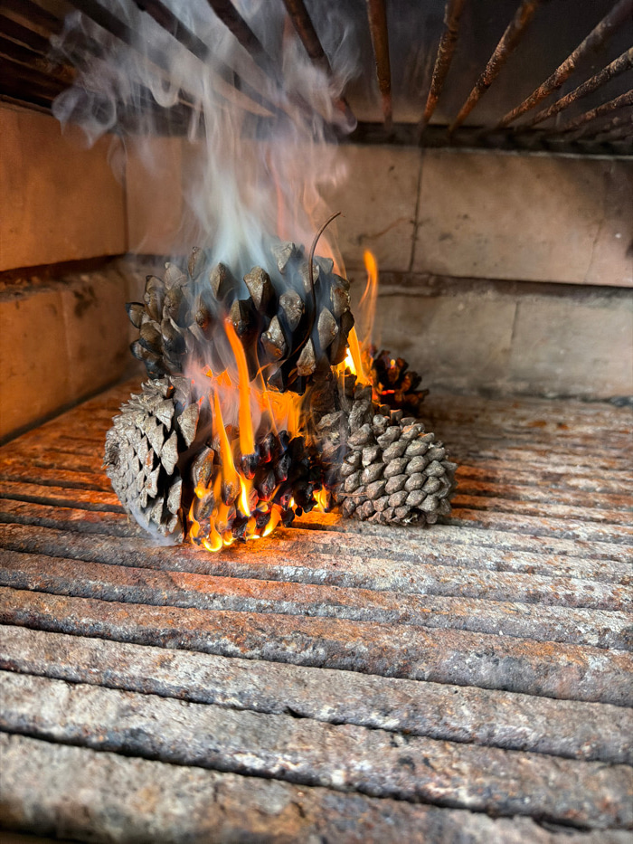 The image depicts several pine cones actively burning on a heavily rusted metal grate, within an enclosed fire-resistant structure, located in the city of Vila Real, Portugal. Three prominent pine con…read more