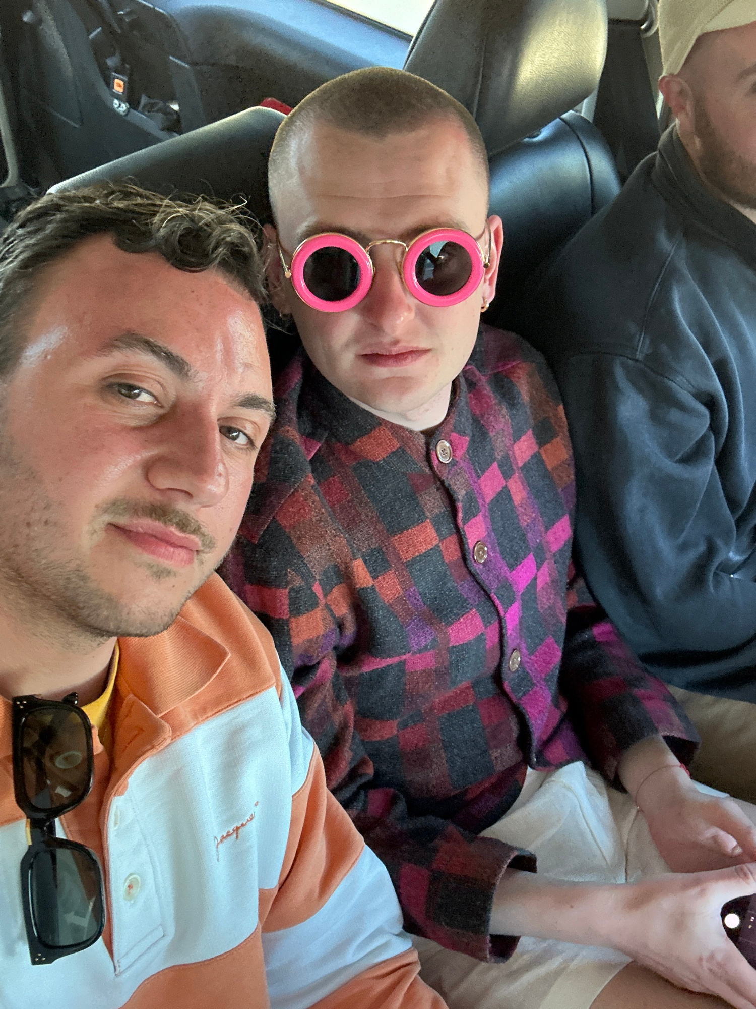 Three individuals are positioned closely together in what appears to be a vehicle. The image is taken from an overhead perspective. A man with closely cropped hair and pink round sunglasses lies in th…read more