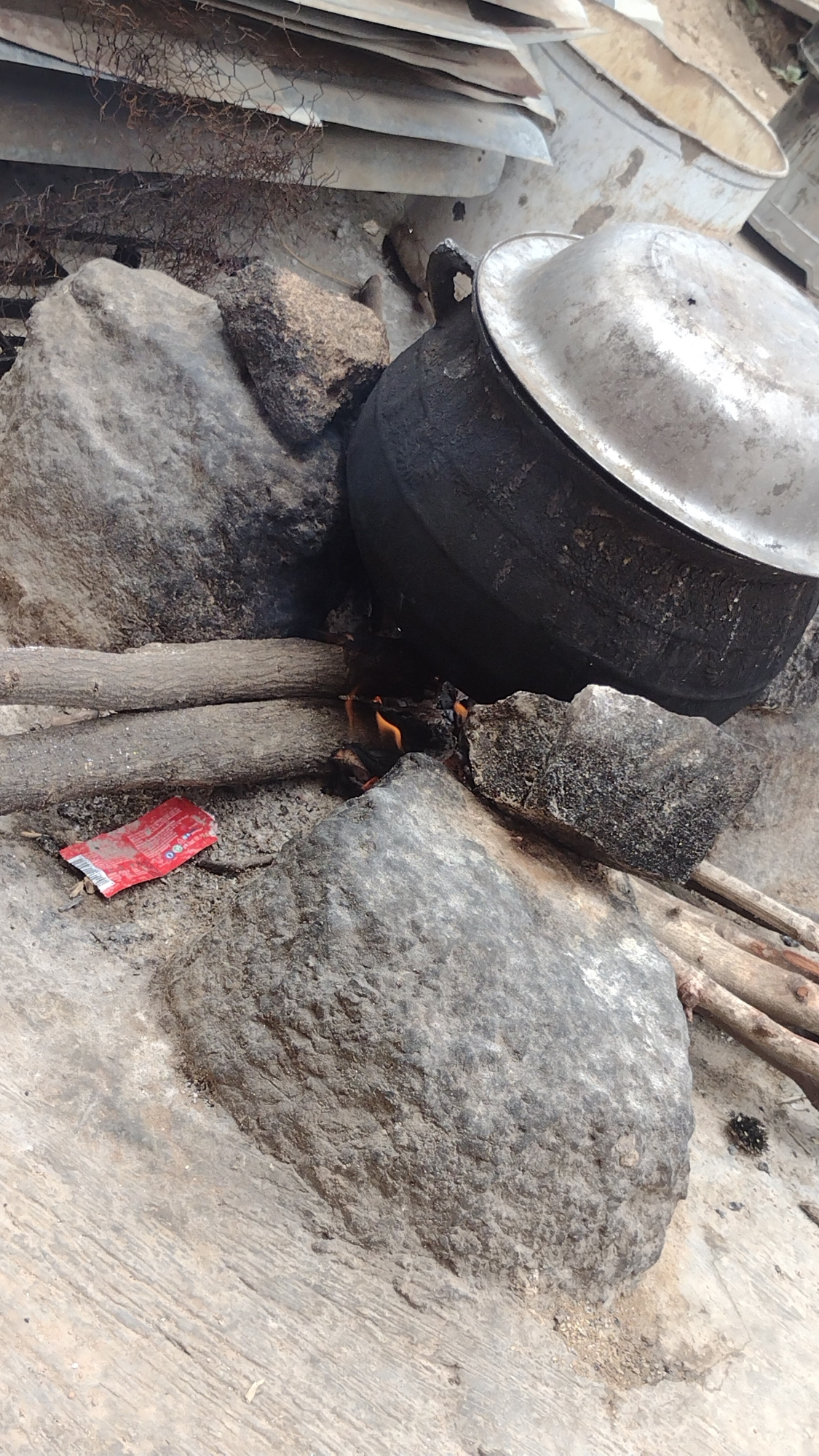 This image depicts a rustic outdoor cooking setup, likely located in Jos, Nigeria, given the provided context. A large, dark-colored cooking pot with a reflective silver lid is positioned over an open…read more