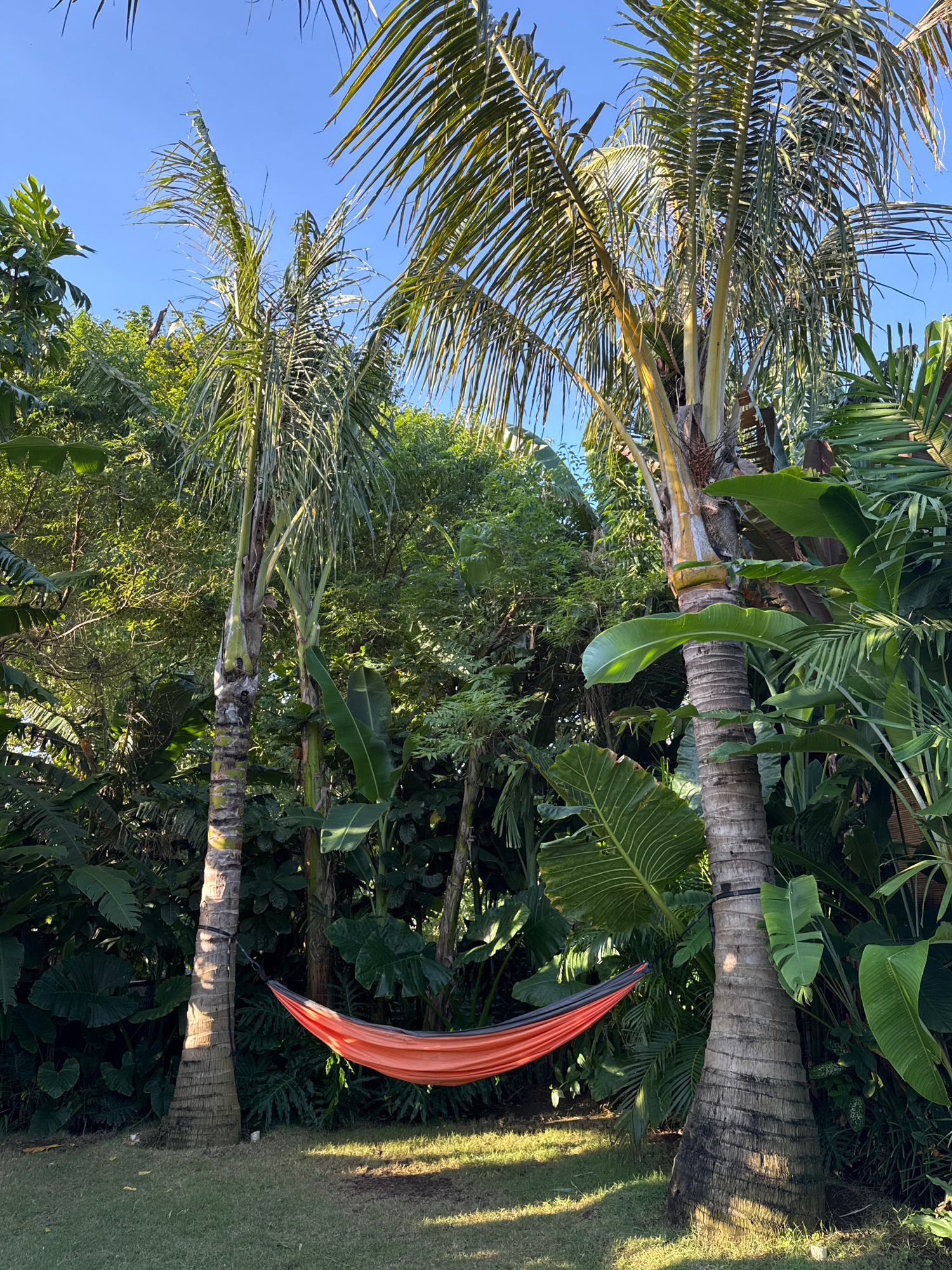 The scene is a lush, outdoor environment, likely a tropical garden, with a hammock strung between two palm trees. The hammock is orange with black edging. The palm trees have textured trunks and abund…read more
