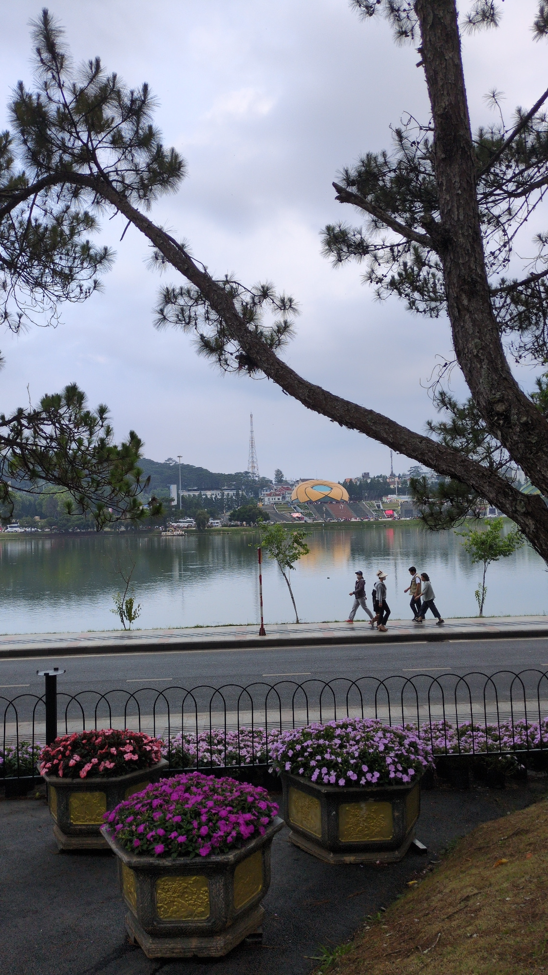 The image captures a scene at Xuân Hương Lake in Đà Lạt, Vietnam. The water of the lake reflects the cityscape, including a prominent, large yellow flower-shaped structure and a tall telecommunication…read more