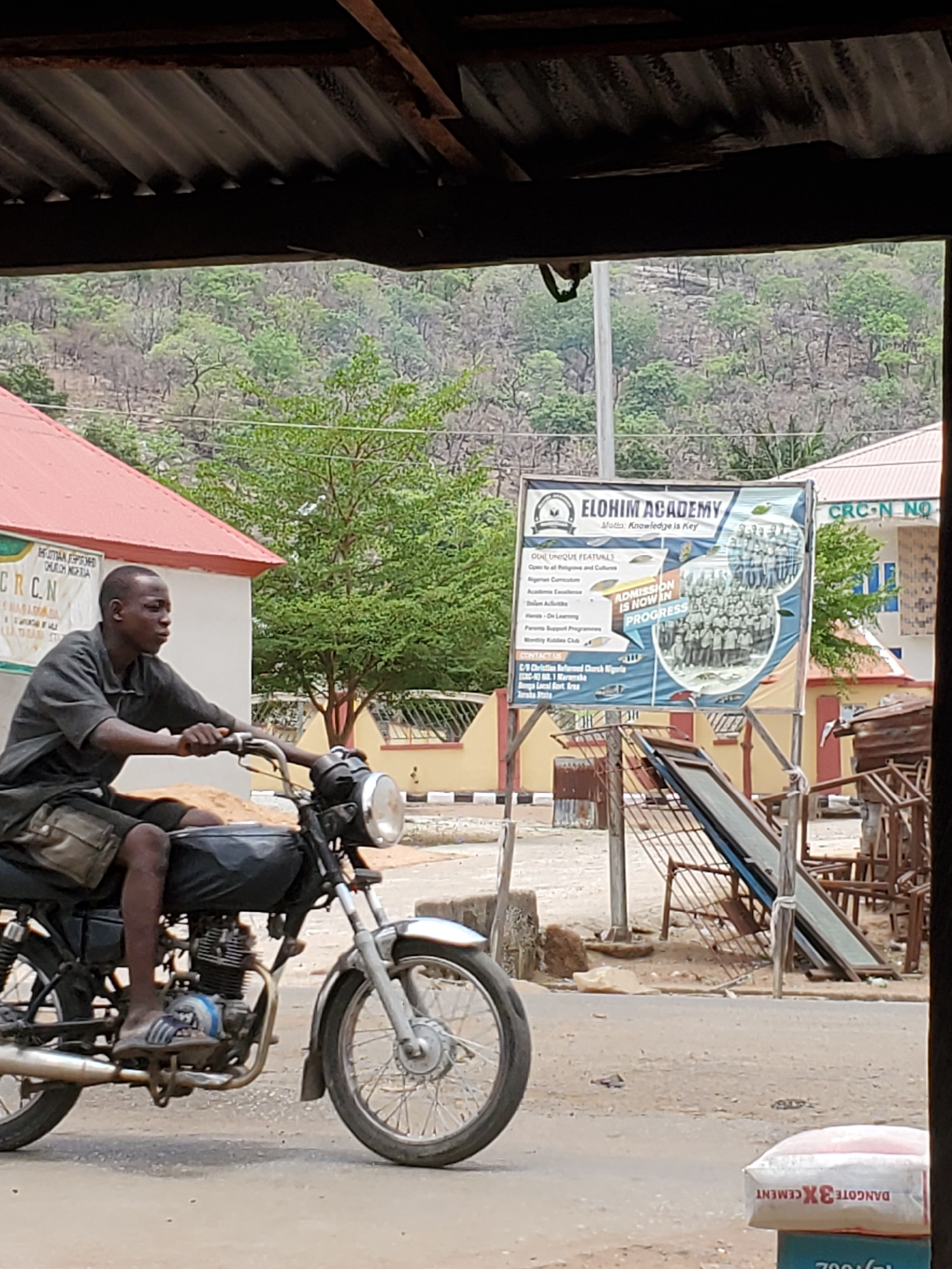 The image shows a man riding a motorcycle on a street in Mararaba, Nigeria. The man is wearing a dark shirt and has a bag slung over his shoulder. He is looking to his left as he drives. The motorcycl…read more
