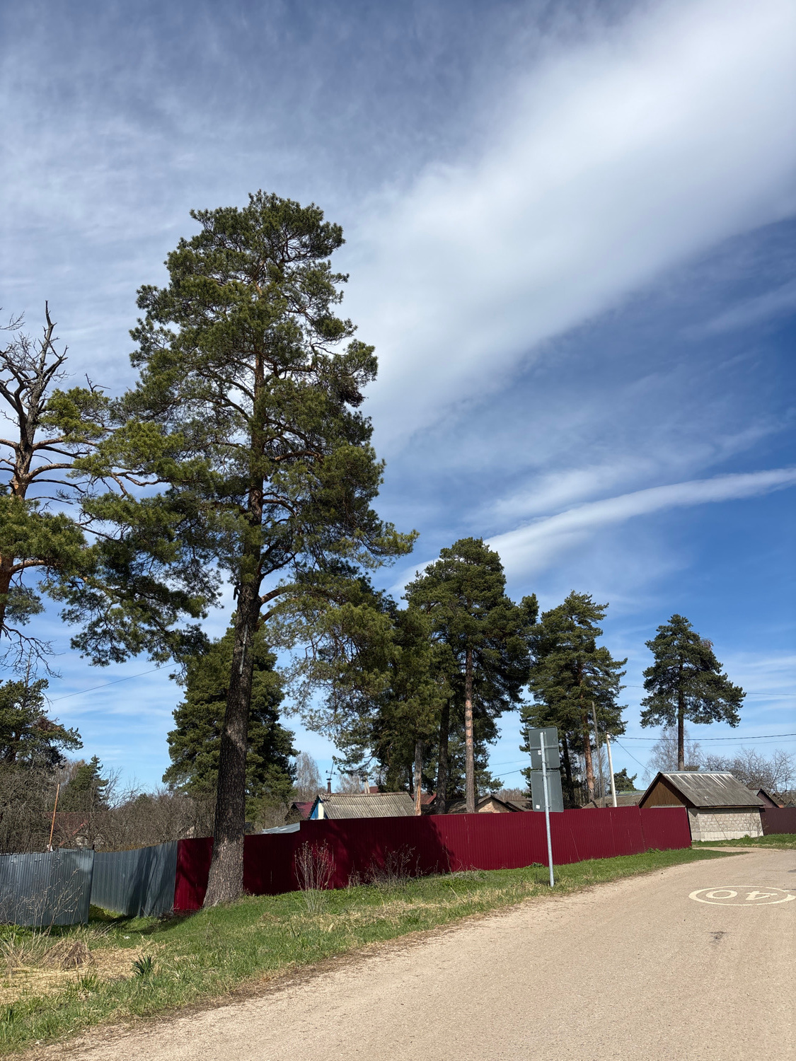 The image depicts a bright, sunny outdoor scene, likely in a rural or suburban residential area in Razdolye, Russia. The perspective is from ground level, looking up towards the sky and across a stree…read more
