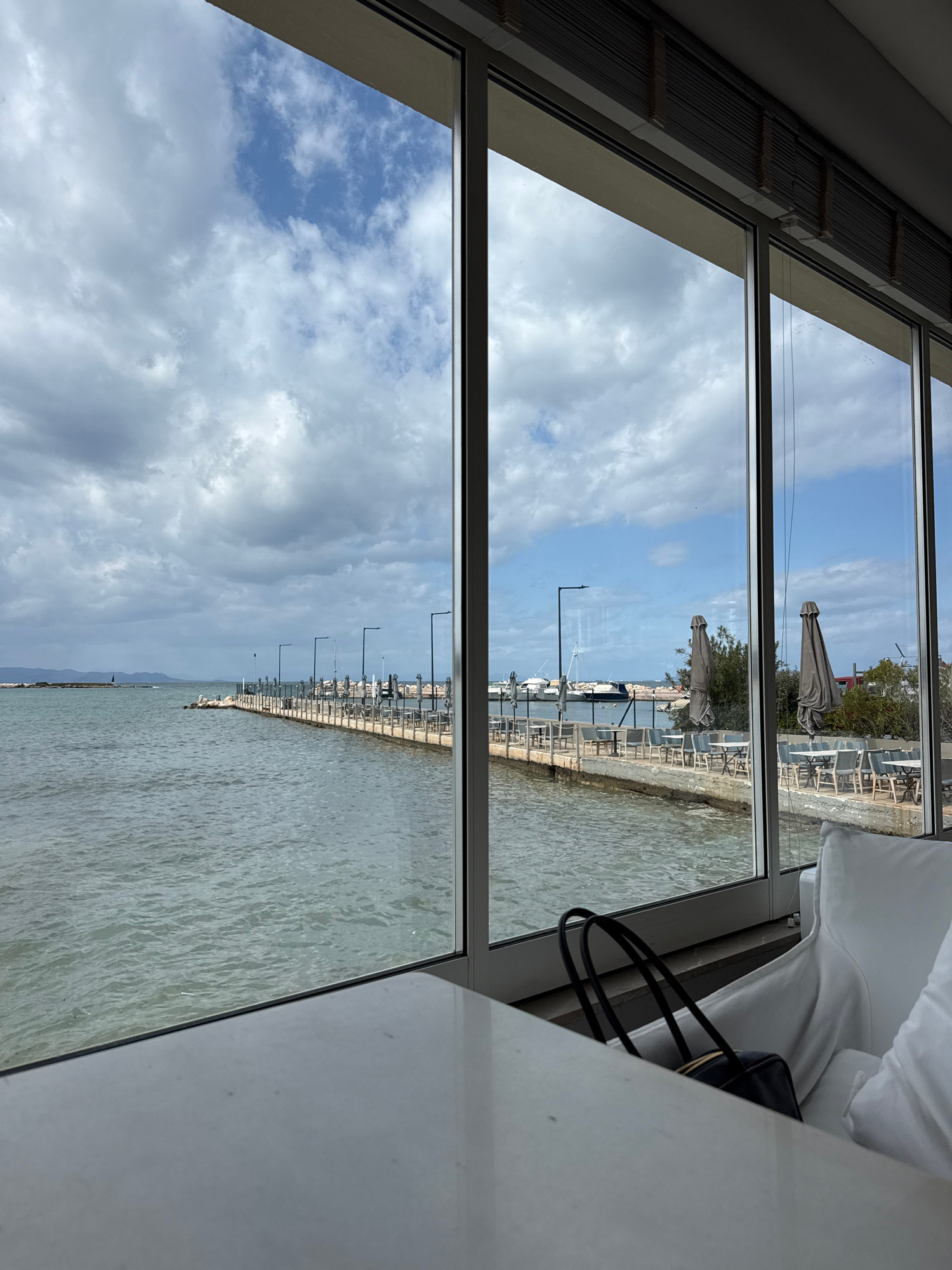 The scene depicts a coastal view in Glyfada, Greece, observed from inside a building through large, multi-paneled glass windows. In the immediate foreground, a reflective white tabletop occupies the l…read more