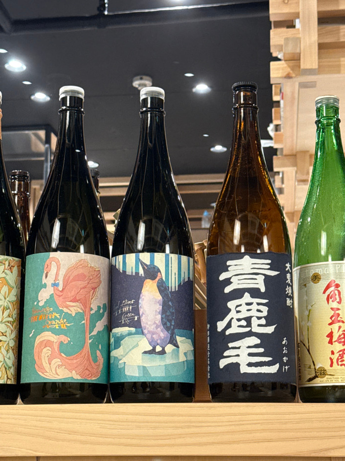 The scene depicts an interior retail environment in Shibuya, Japan, showcasing a selection of five tall glass bottles, likely containing alcoholic beverages, displayed on a light-colored wooden shelf.…read more