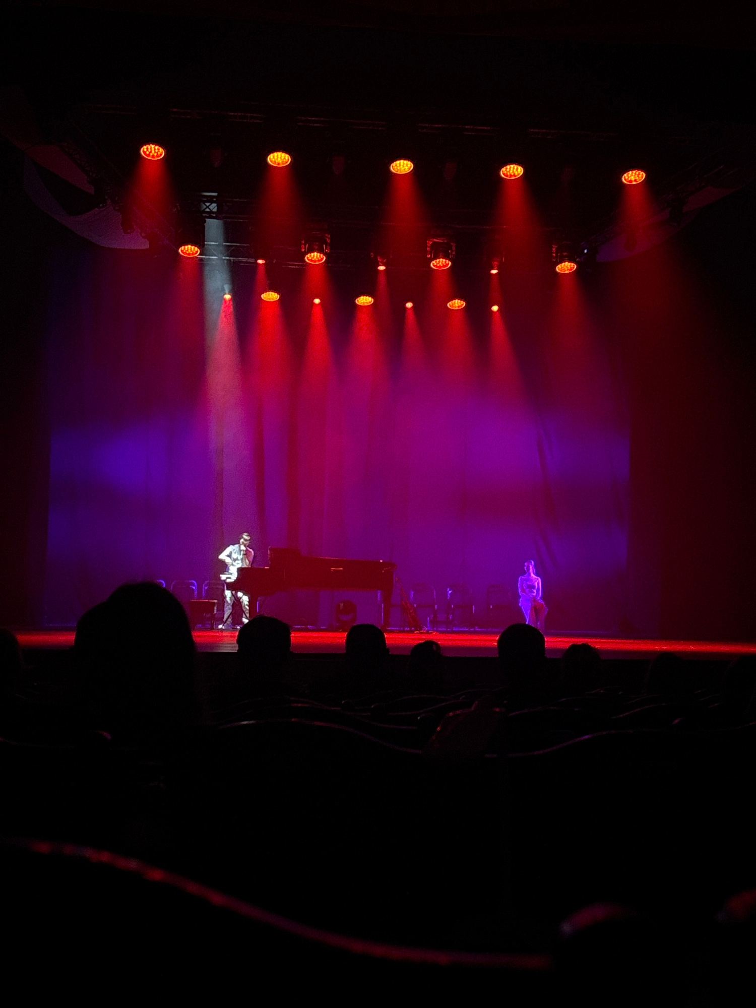 The image shows a theatrical stage in Perm, Russia, lit with a combination of red and purple lighting. A grid of round, red stage lights are visible on the left, with their beams casting a red hue acr…read more