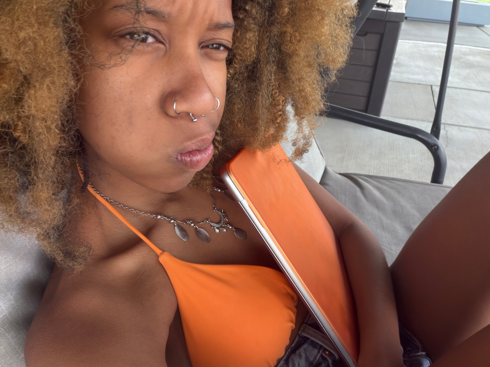A close-up, eye-level selfie shows a young woman with light brown curly hair and a light brown complexion, looking directly at the camera with a pouting expression. Her left eye is visible, and she ha…read more
