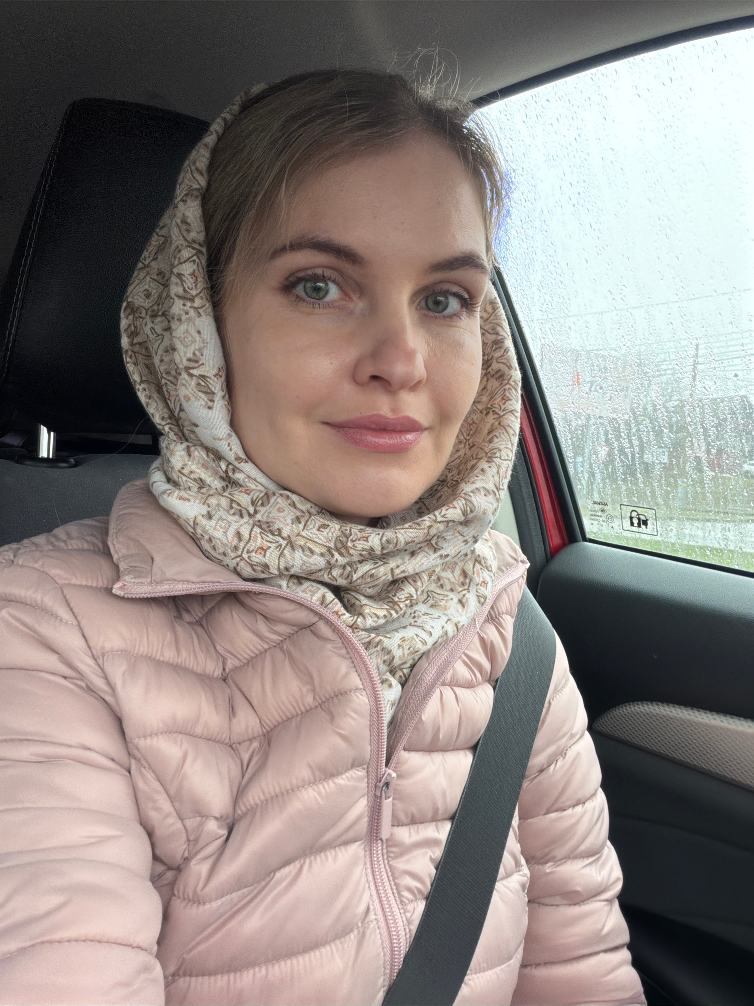 A woman with fair skin and green eyes is sitting in a car, wearing a light pink puffer jacket and a patterned scarf or head covering. She has a seatbelt fastened across her chest. Outside the car wind…read more