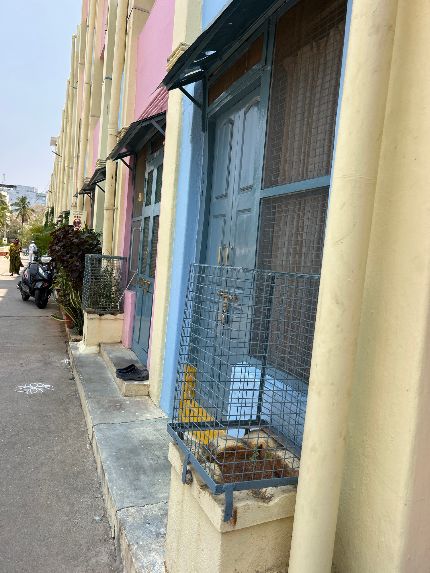 The image depicts a street in Puttaparthi, India, lined with buildings featuring repeating architectural elements. The buildings are two-story structures with pale yellow upper floors and pastel-color…read more