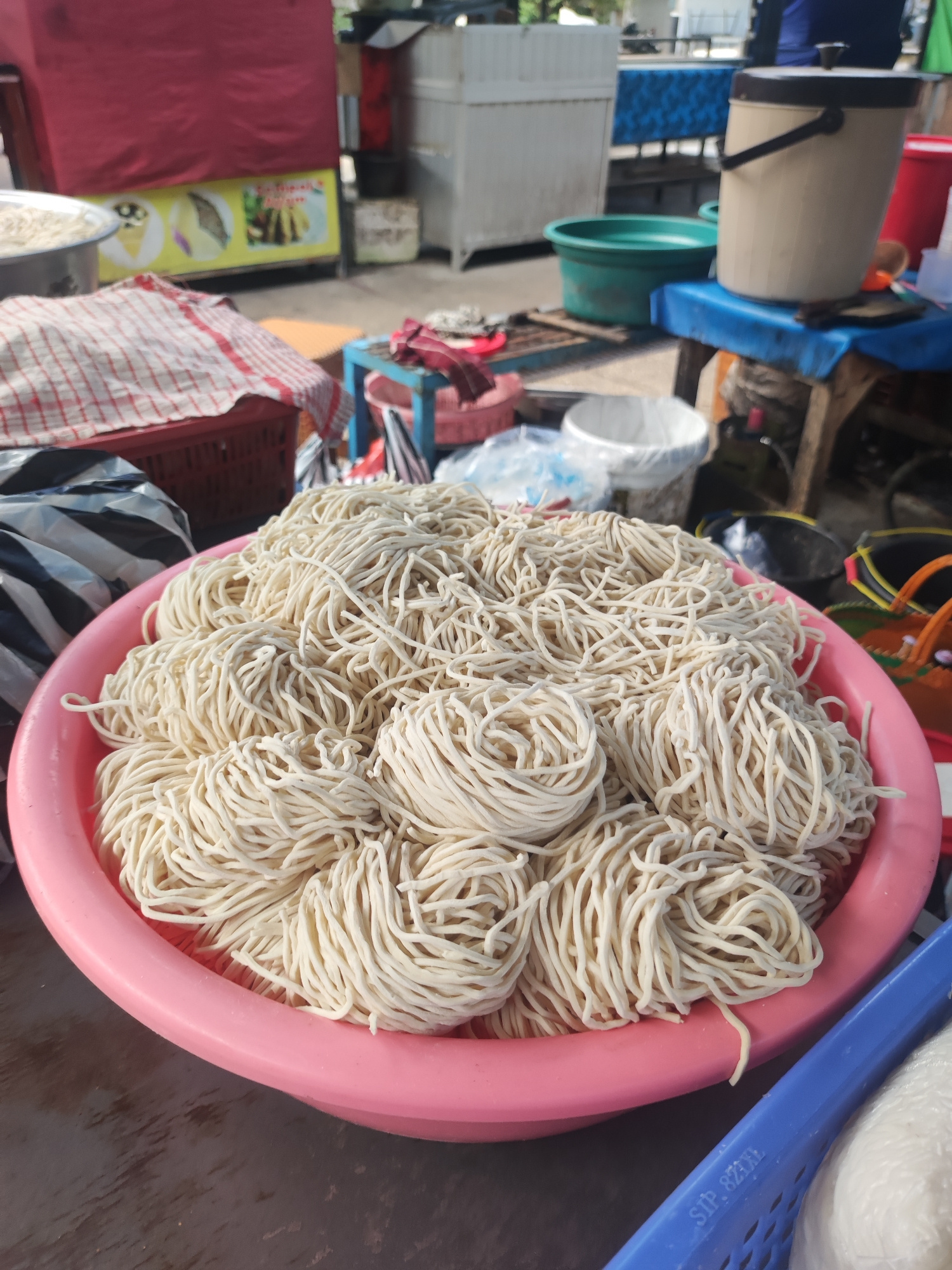 The image shows a pink plastic bowl filled with bundles of fresh, uncooked noodles. The bowl is resting on a surface with a textured appearance, possibly a table or countertop. In the background, ther…read more