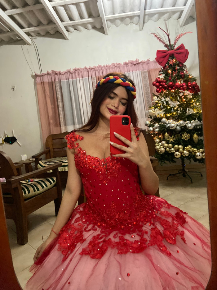 A young woman in a red, elaborately decorated dress poses for a selfie in a mirror. She wears a colorful braided headband. A Christmas tree stands in the background with red and gold ornaments. The ro…read more