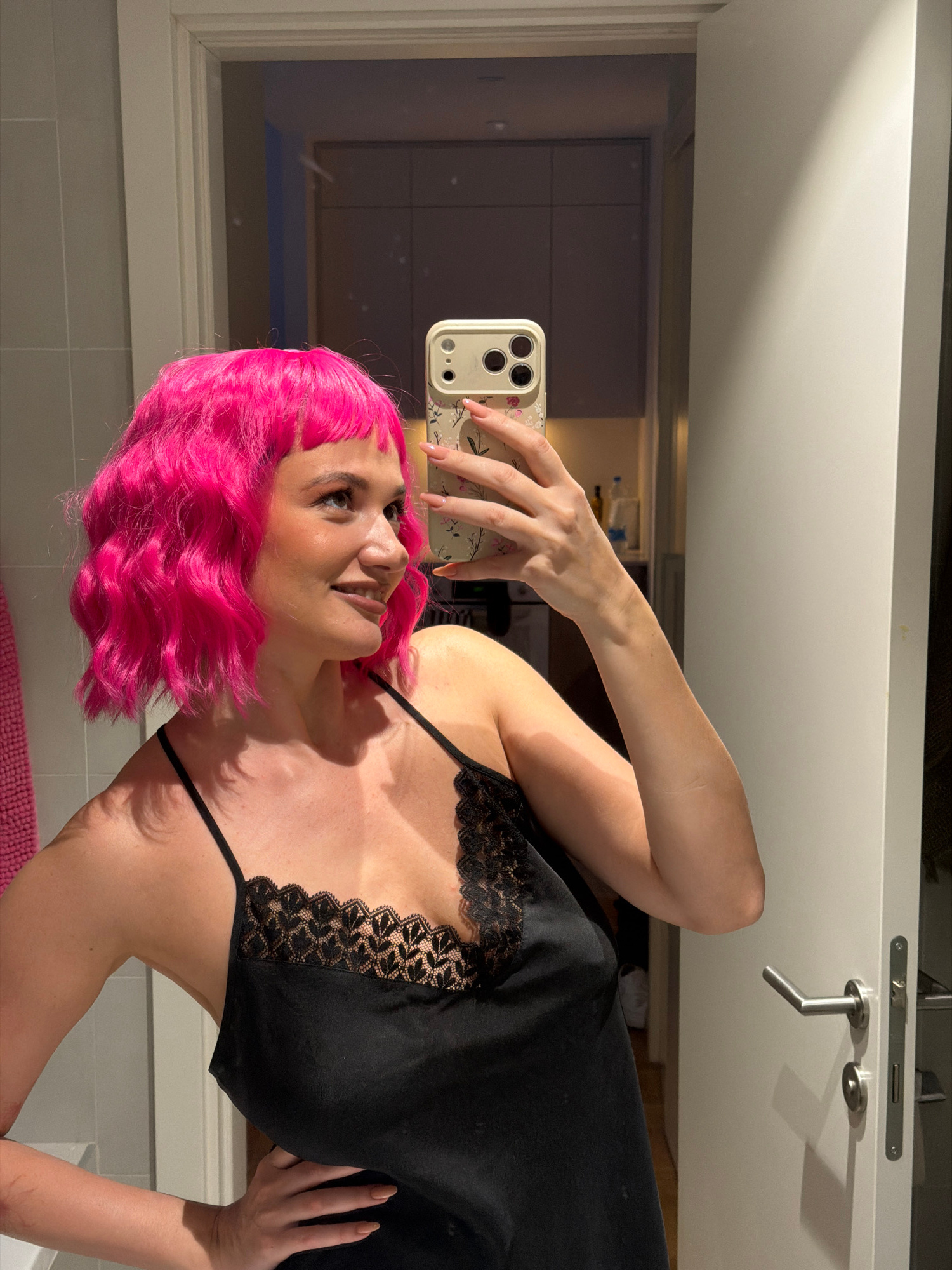 A woman with vibrant pink hair is taking a selfie in a bathroom. She is wearing a black slip dress with lace trim. Her hand is holding an iPhone with a light-colored patterned case. The bathroom has l…read more