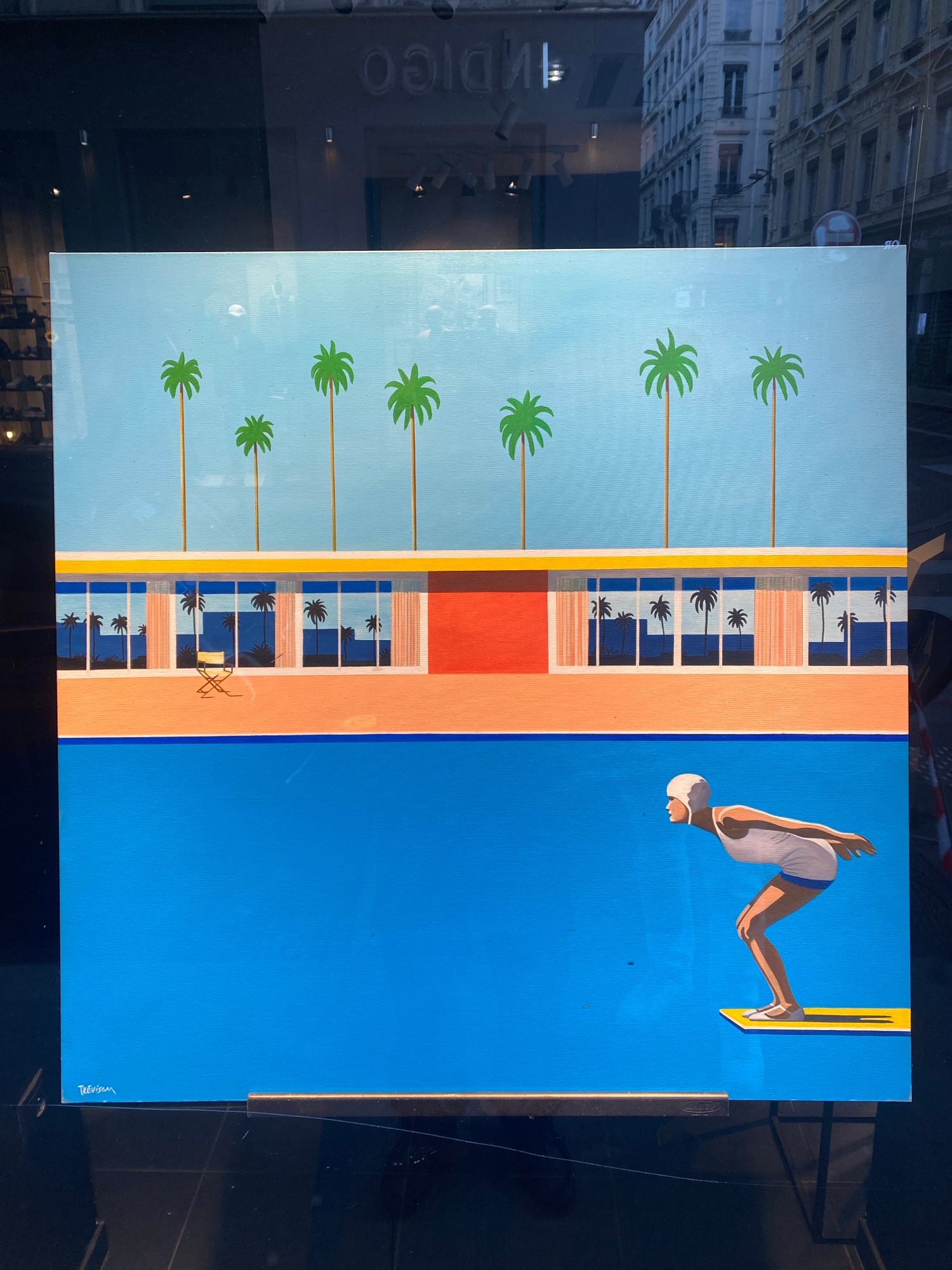 The image depicts a painting displayed in a window, likely for sale or exhibition. The painting features a stylized scene with palm trees against a light blue sky on the left side. Adjacent to the palβ¦read more