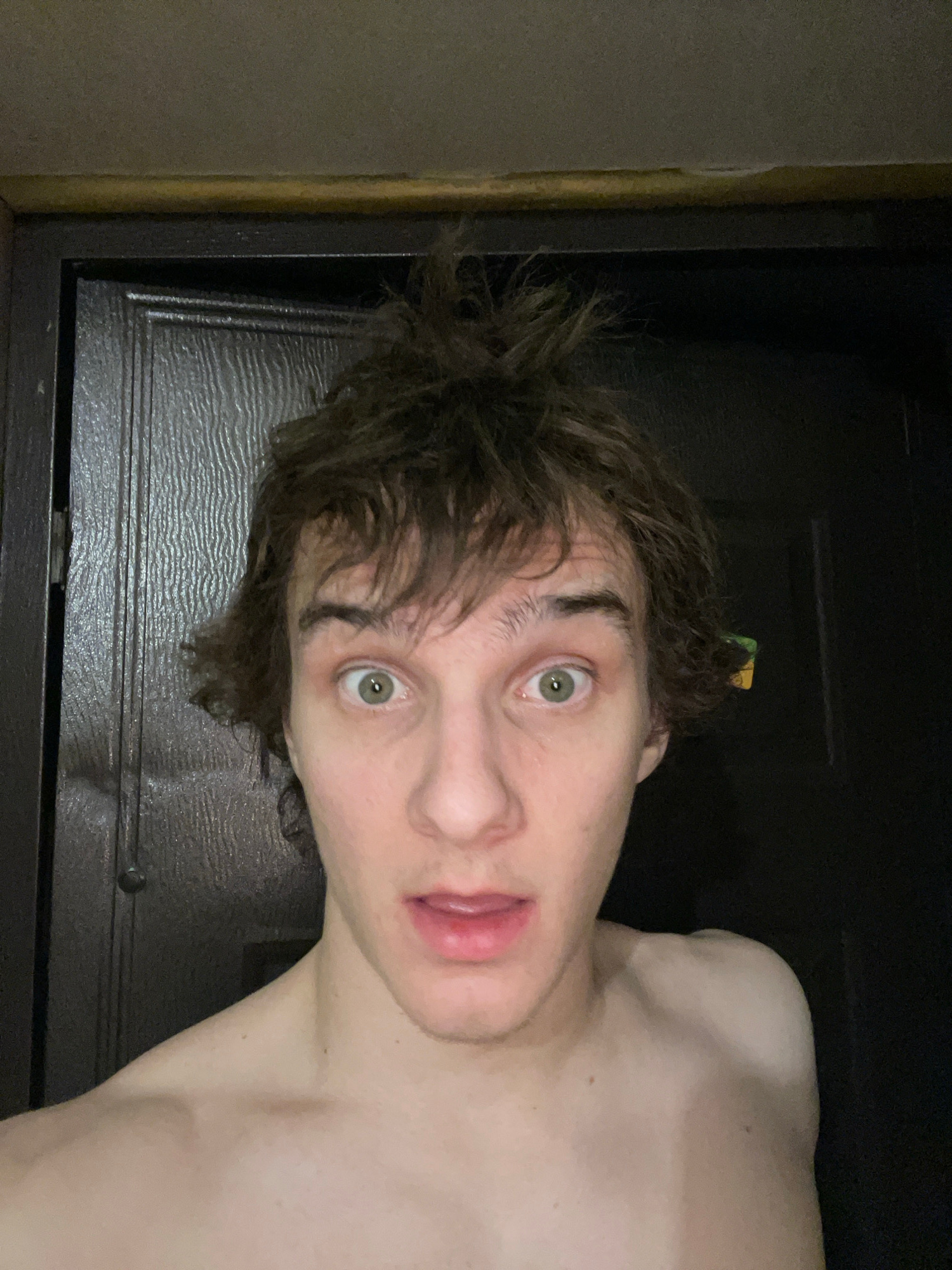 A disoriented-looking, shirtless, fair-skinned person with disheveled dark brown hair and green eyes appears to be taking a selfie. The background includes a dark-colored door or surface with horizont…read more