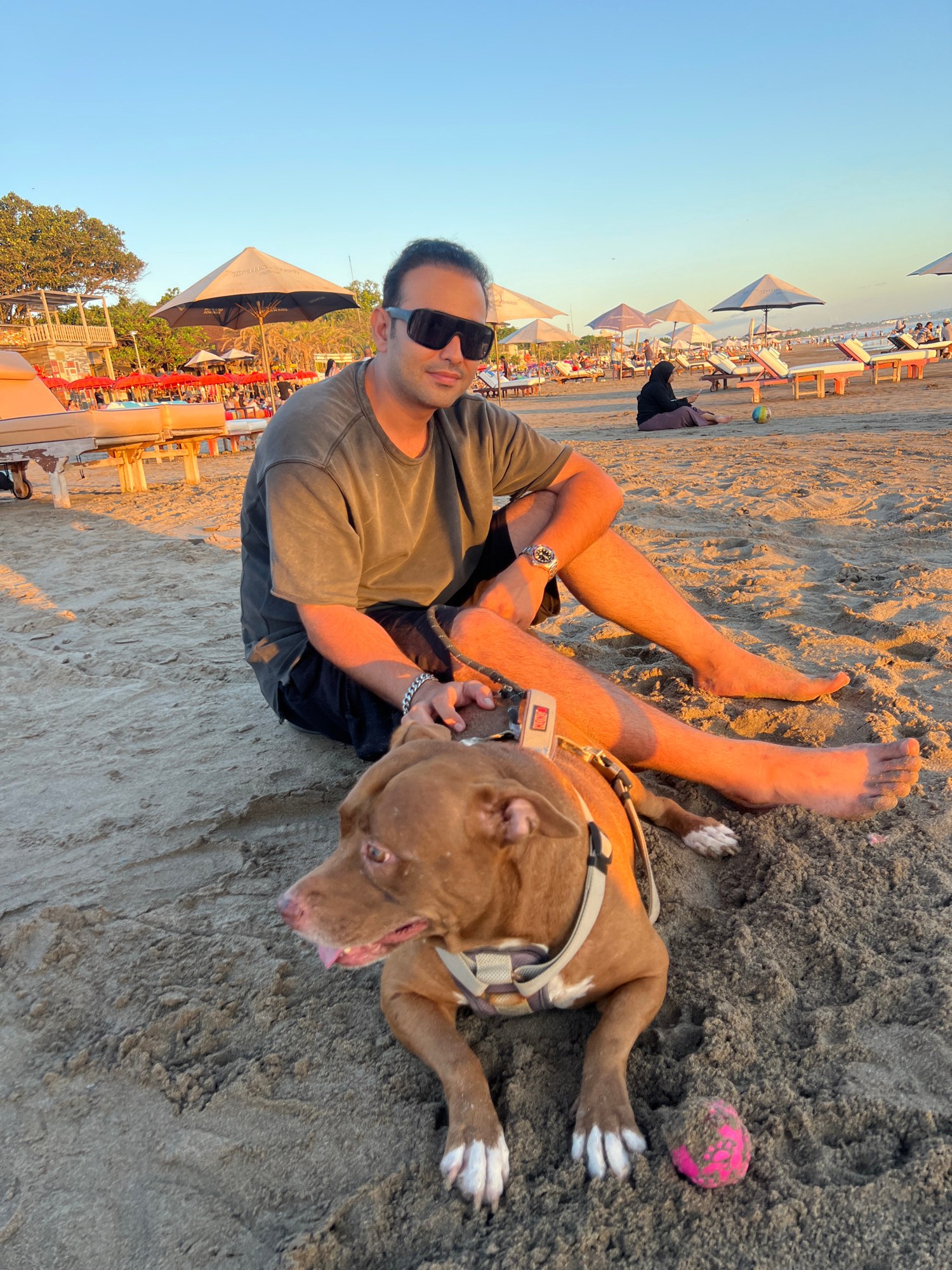 An overhead shot captures a man and a dog relaxing on a sandy beach. The image is oriented sideways, but depicts the subjects lying parallel to the horizon. The man, wearing dark sunglasses, a dark g…read more