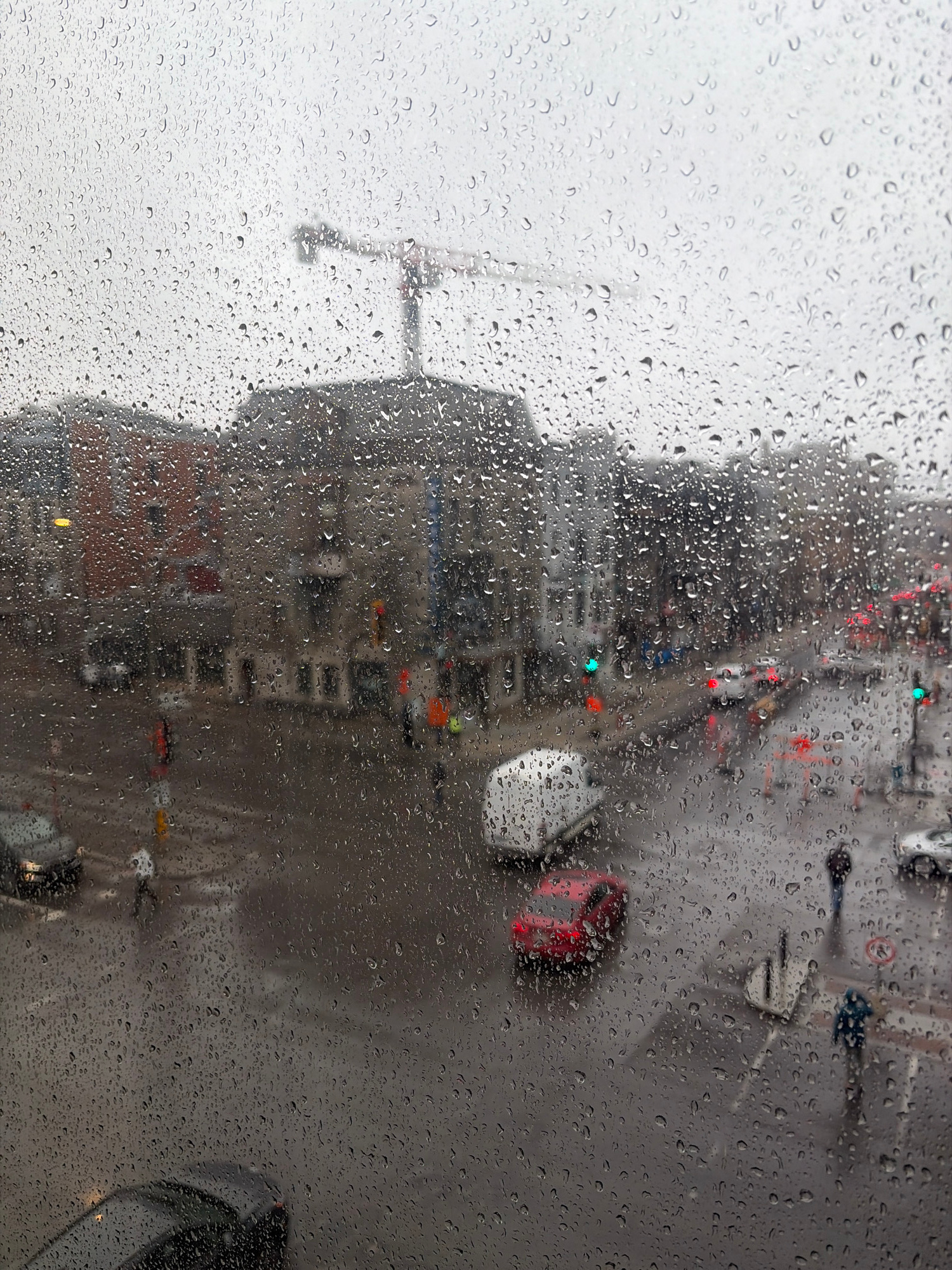 The image shows a rain-covered window with a view of a city street. A tall building is visible on the left side of the image. There are traffic lights and cars on the street below. The scene appears t…read more