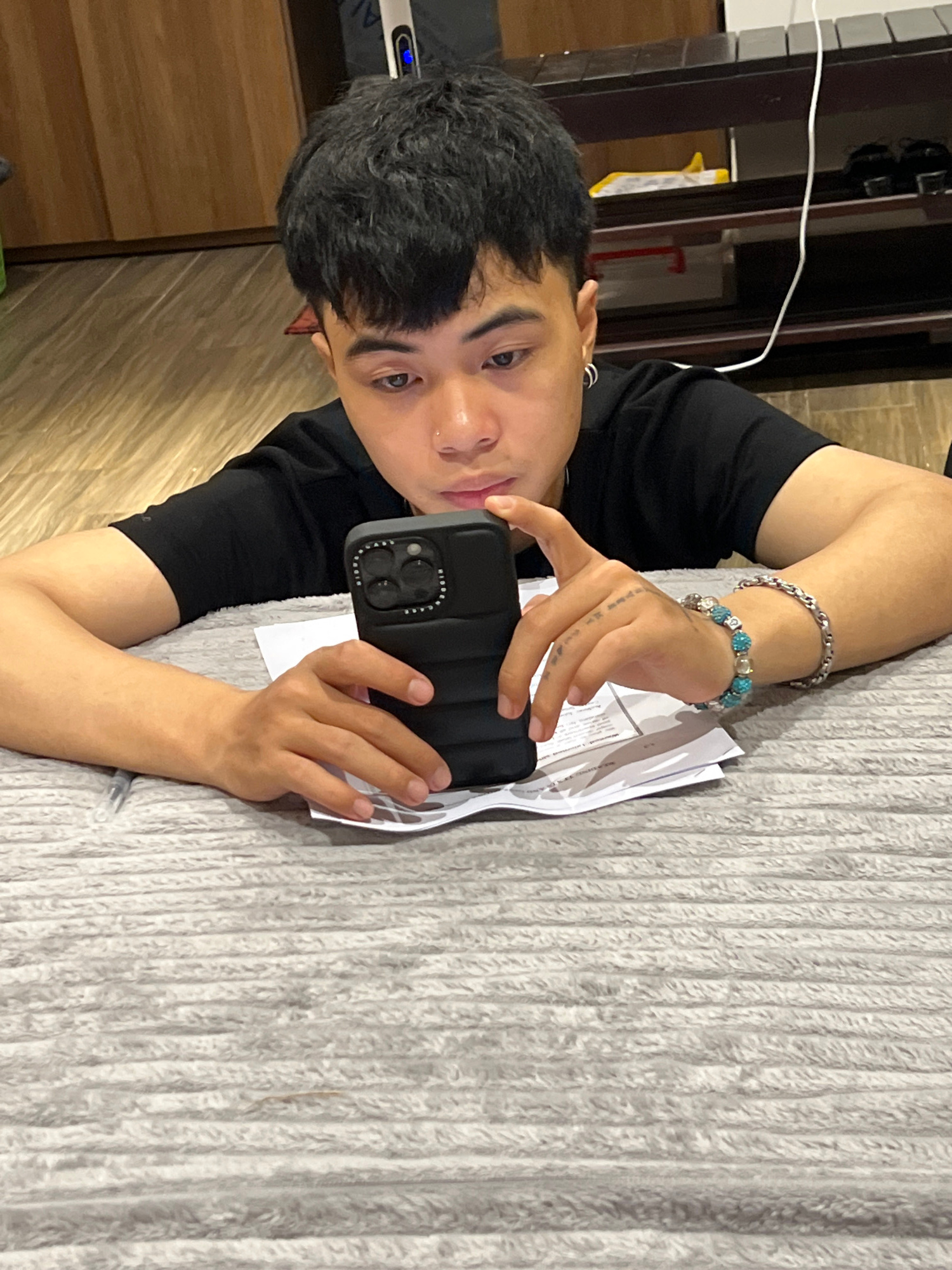A person with dark hair and a nose piercing is holding a black phone with three camera lenses. The person is wearing a black shirt and has two bracelets on their left wrist. They are holding the phone…read more