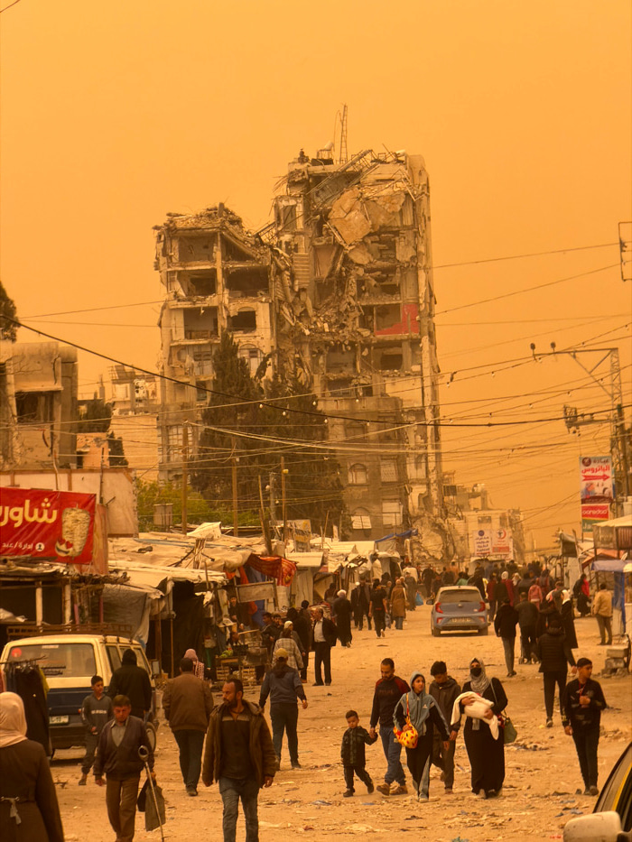 An urban street scene in Gaza City, Palestinian Territory, is depicted under a pervasive orange, dusty sky. In the background, a multi-story concrete building stands severely damaged, exhibiting exten…read more