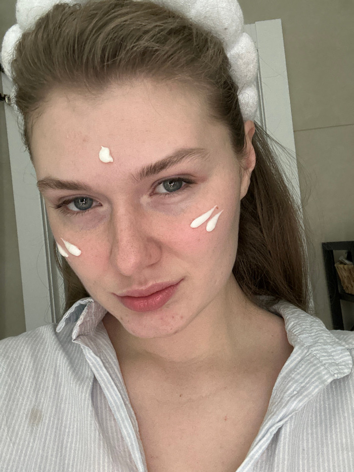 A fair-skinned woman with light brown hair wears a white, terry cloth headband and a striped button-down shirt. Three dollops of white cream or lotion are visible on her face: two on her right cheek,…read more
