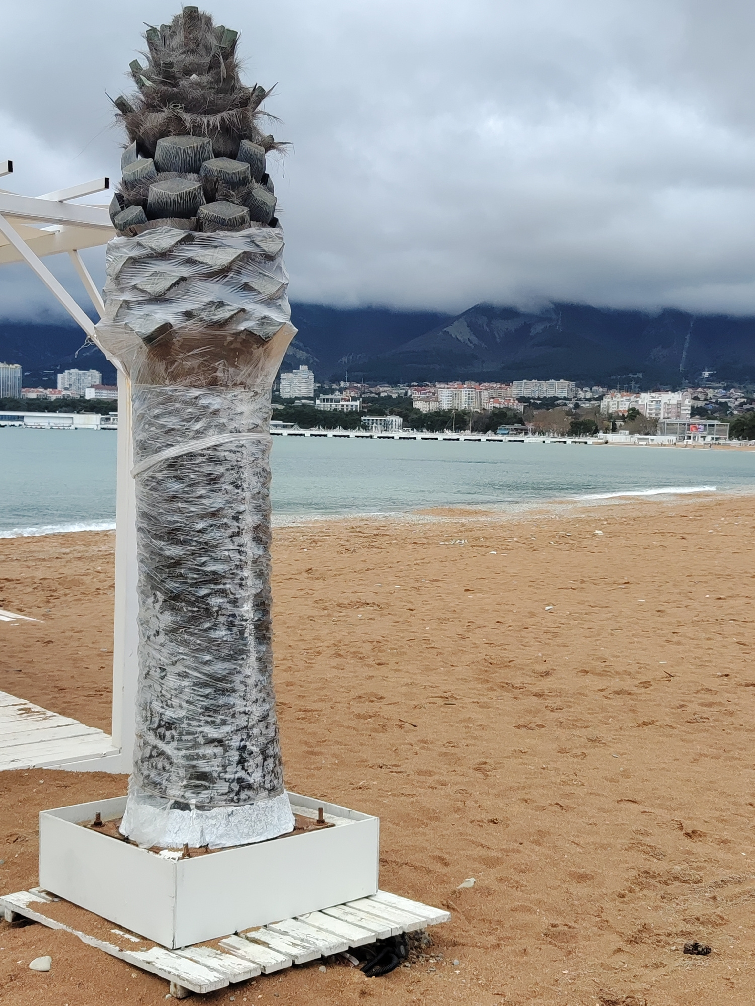 The photograph depicts a palm tree wrapped in plastic on a beach in Gelendzhik, Russia. The tree stands on a platform and is next to a structure with white beams. In the background are buildings, the…read more