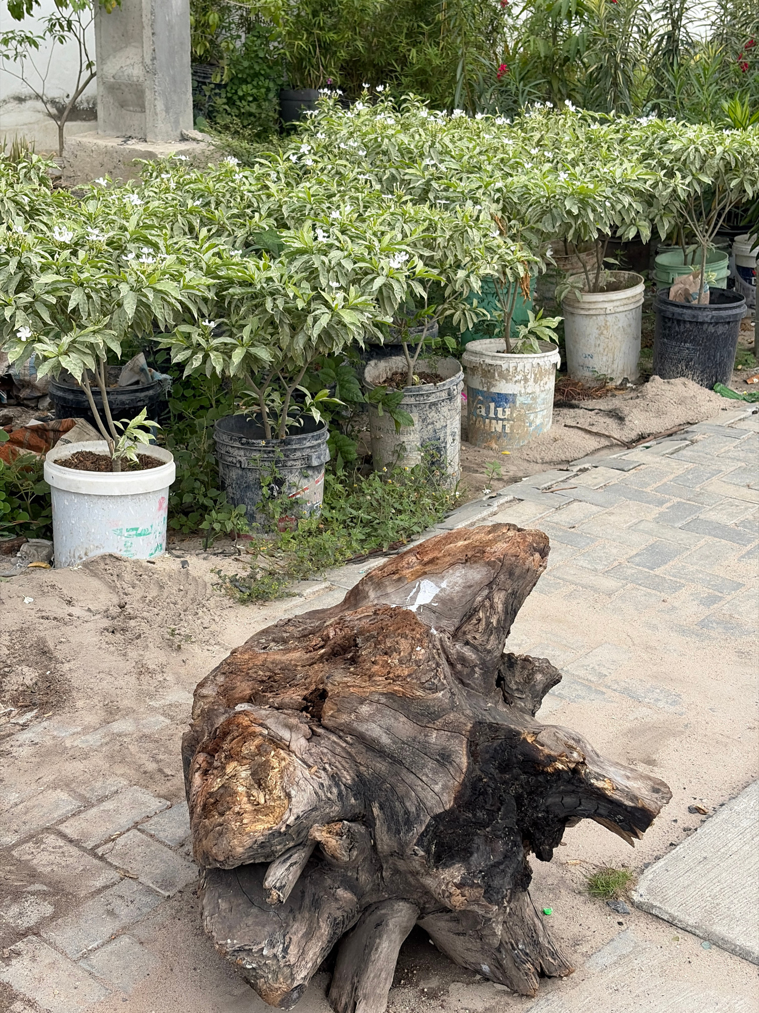 The image depicts an outdoor scene in Igboefon, Nigeria. A row of potted plants with white flowers lines the left side of the frame, in various stages of growth and containers. A large, weathered tree…read more