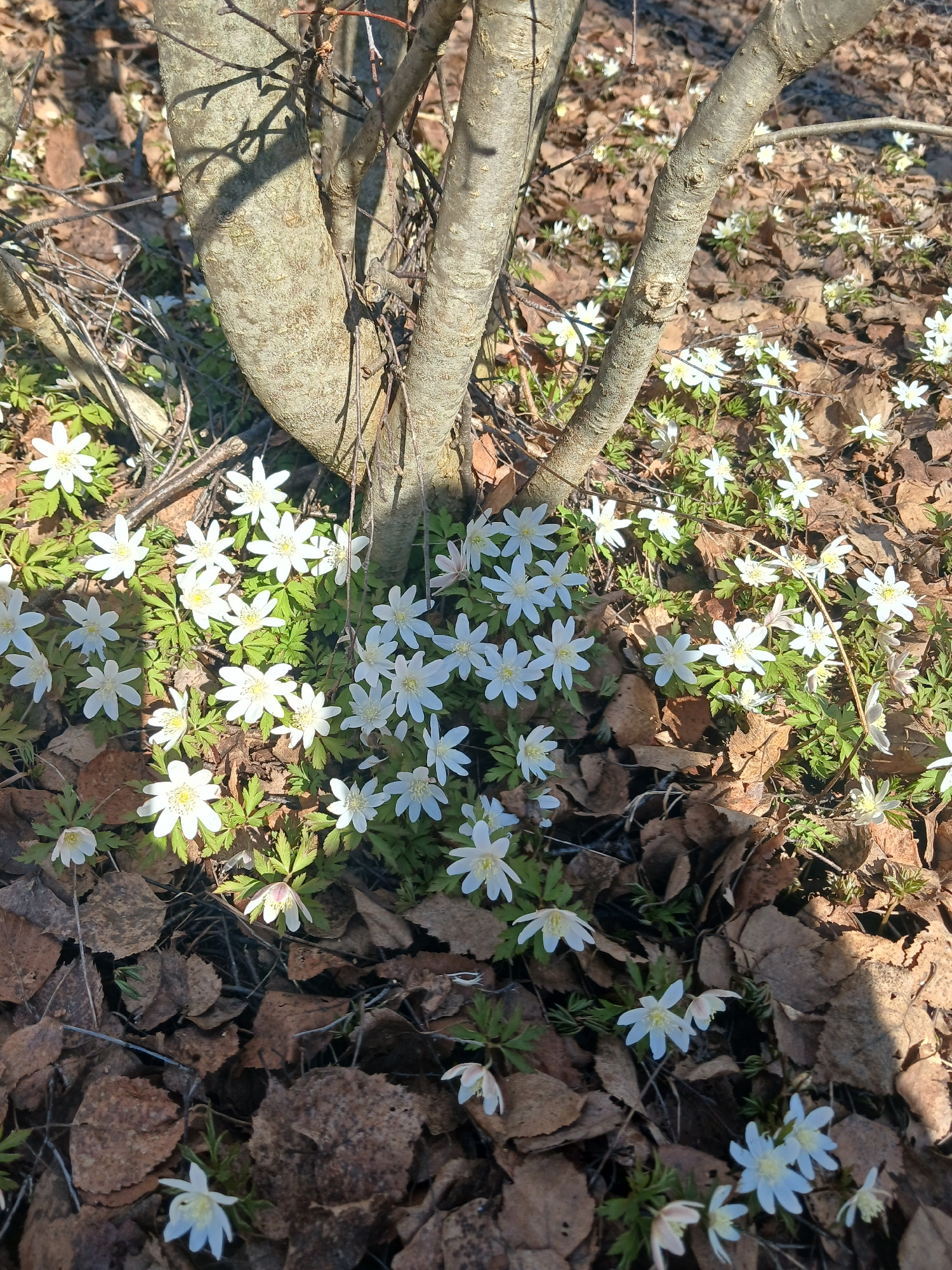 The image displays a close-up view of a forest floor in Bolshaya Sosnova, Russia, likely in early spring. The ground is covered with numerous white, star-shaped flowers, identifiable as wood anemones…read more